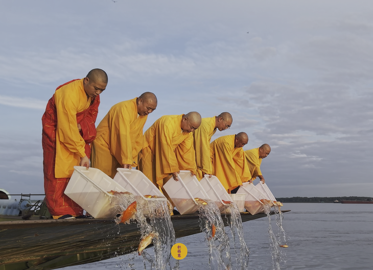 长江之畔,梵音再起,主法法师领众如法恭诵放生仪轨,祈请大悲观世音菩萨慈力加被。