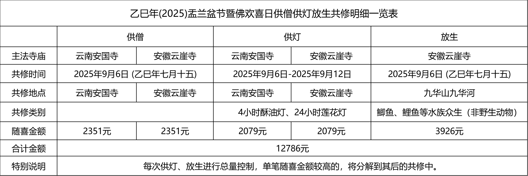 附表:供僧供灯放生共修明细一览表