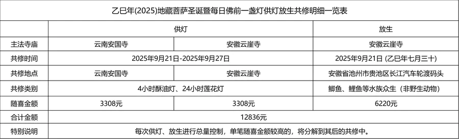 积福慧乙巳年(2025)地藏菩萨圣诞暨每日佛前一盏灯供灯、长江大放生共修自2025年8月25日启建,至2025年9月21日停止接收功德款,共计28天。
