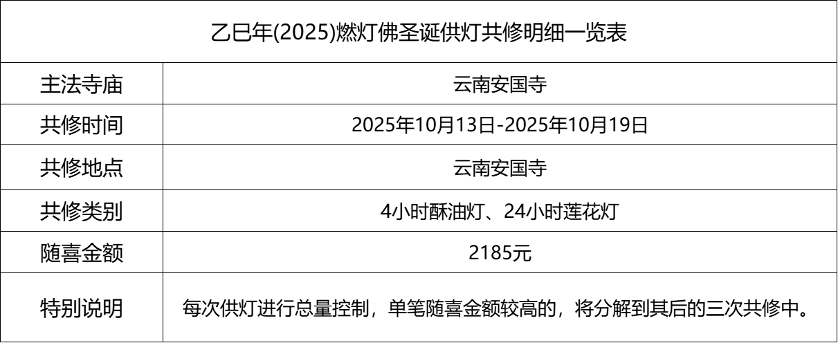 2025年10月13日,乙巳年八月廿二,云南安国寺启建燃灯佛圣诞供灯法会,如理如法按次第起供,至2025年10月19日供圆满。