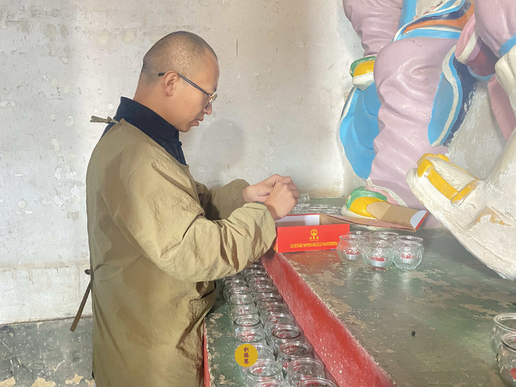 法师引领义工师兄们布置供灯现场
