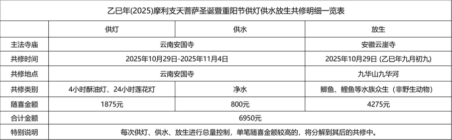 积福慧乙巳年(2025)摩利支天菩萨圣诞暨重阳节供灯供水放生共修自2025年10月15日启建,至2025年10月29日停止接收功德款,共计15天。
