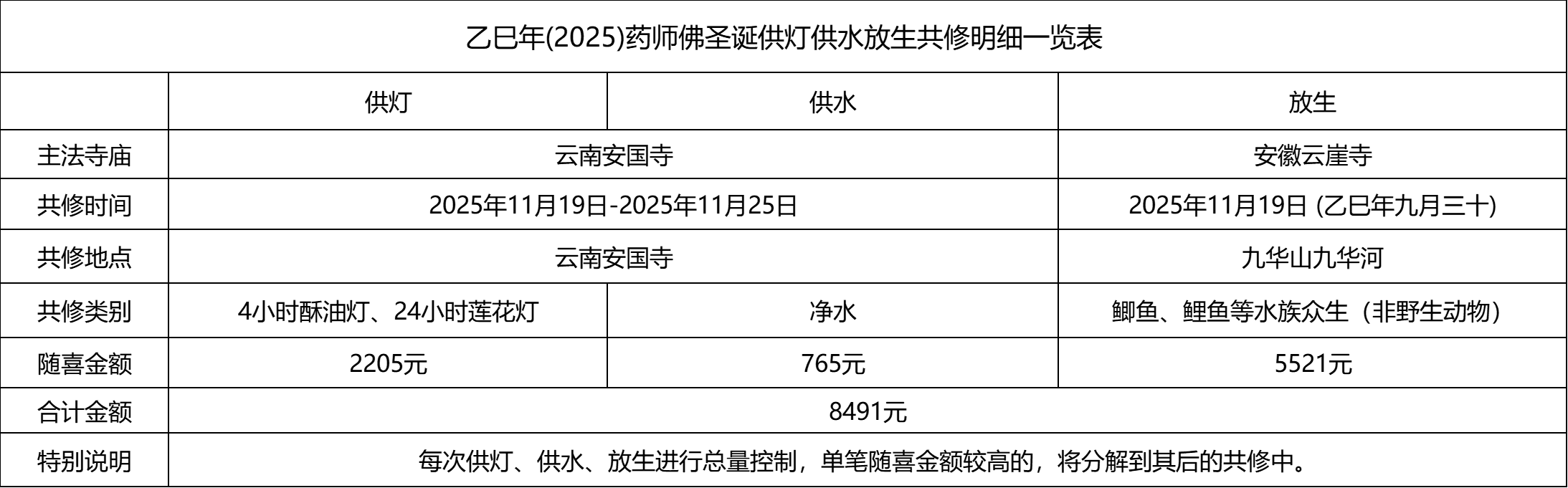 积福慧乙巳年(2025)药师佛圣诞供灯供水放生共修自2025年11月1日启建,至2025年11月19日停止接收功德款,共计19天。