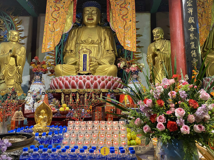 大雄宝殿内,药师如来端坐莲台,手持药钵,目光垂视着娑婆世界的一切病苦与祈愿。
