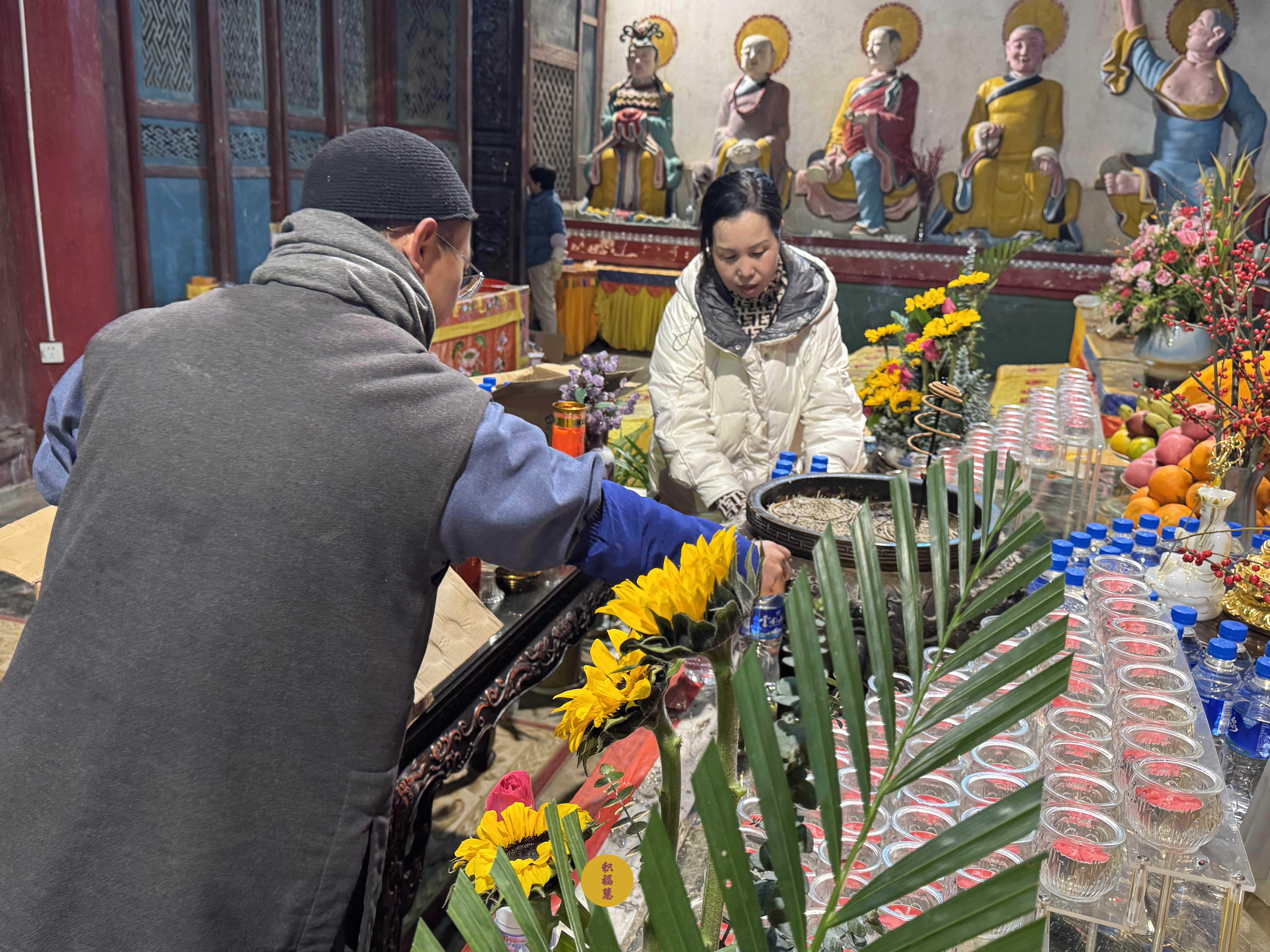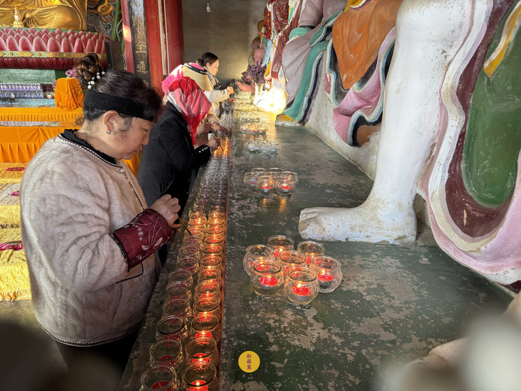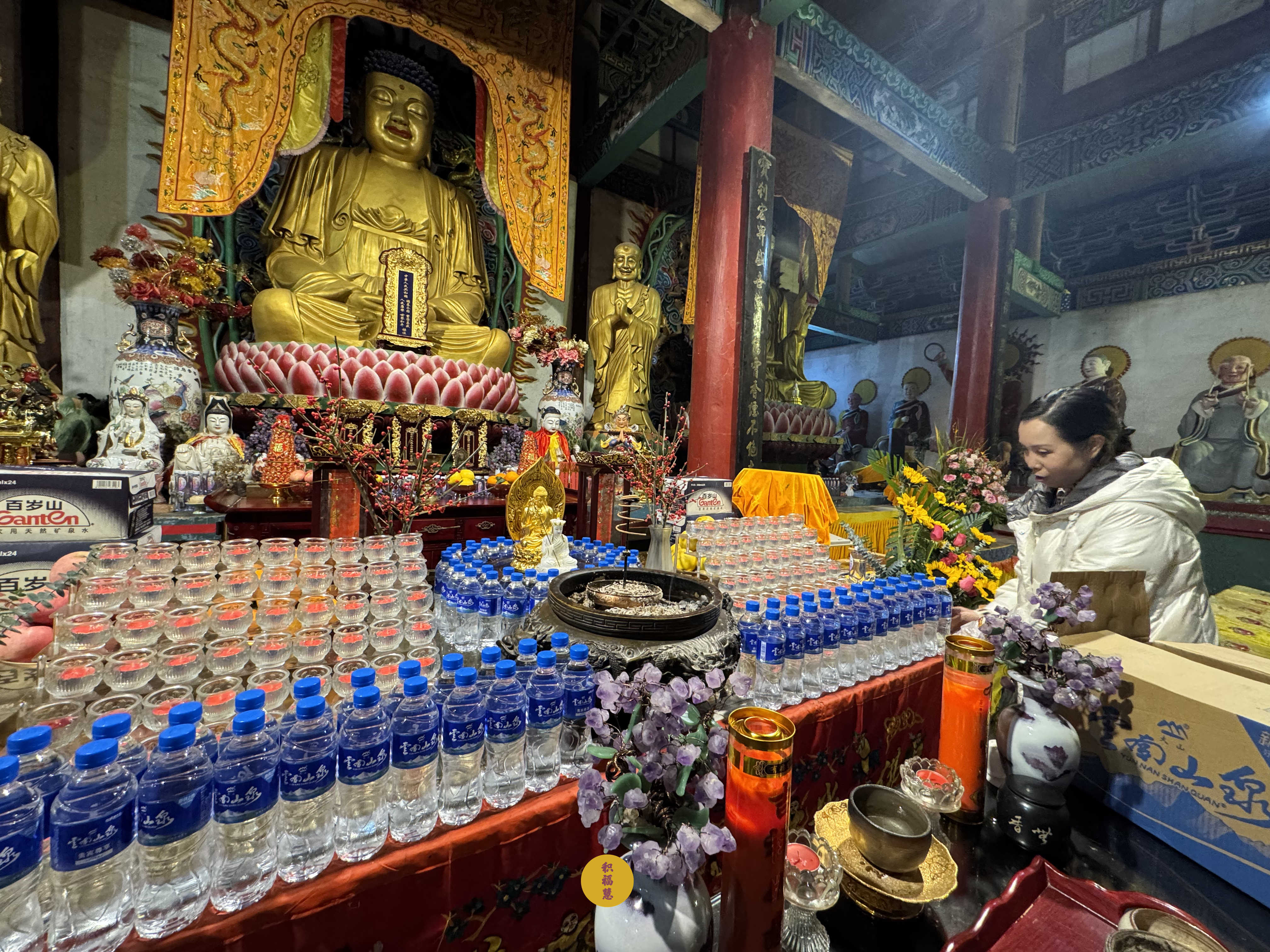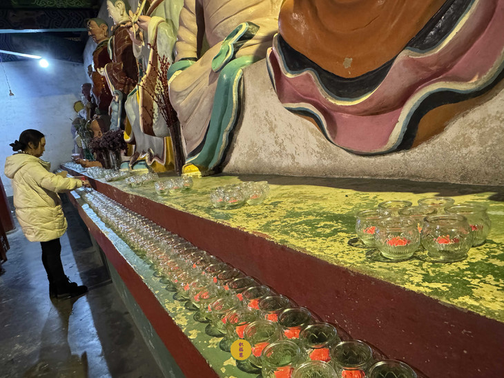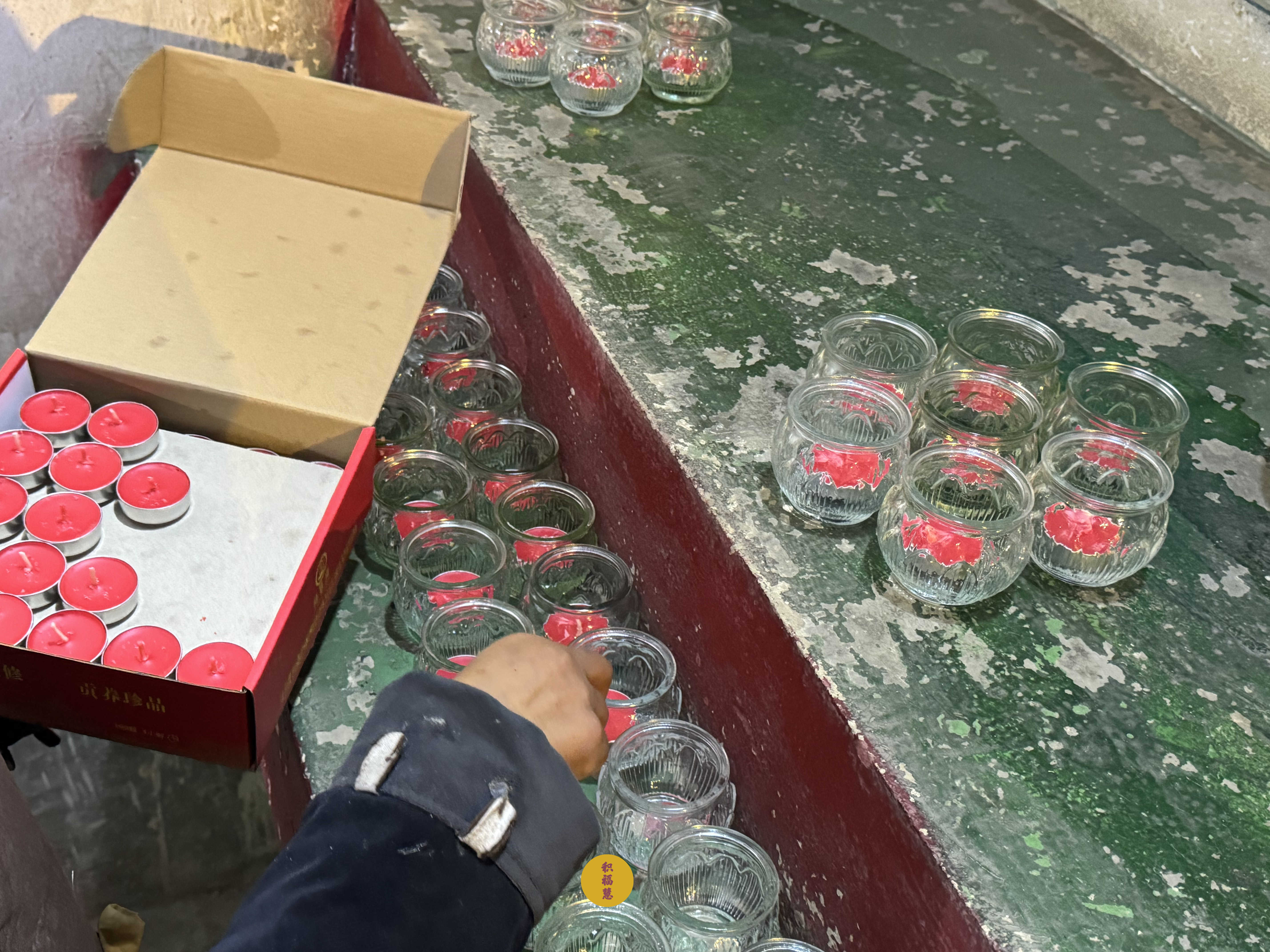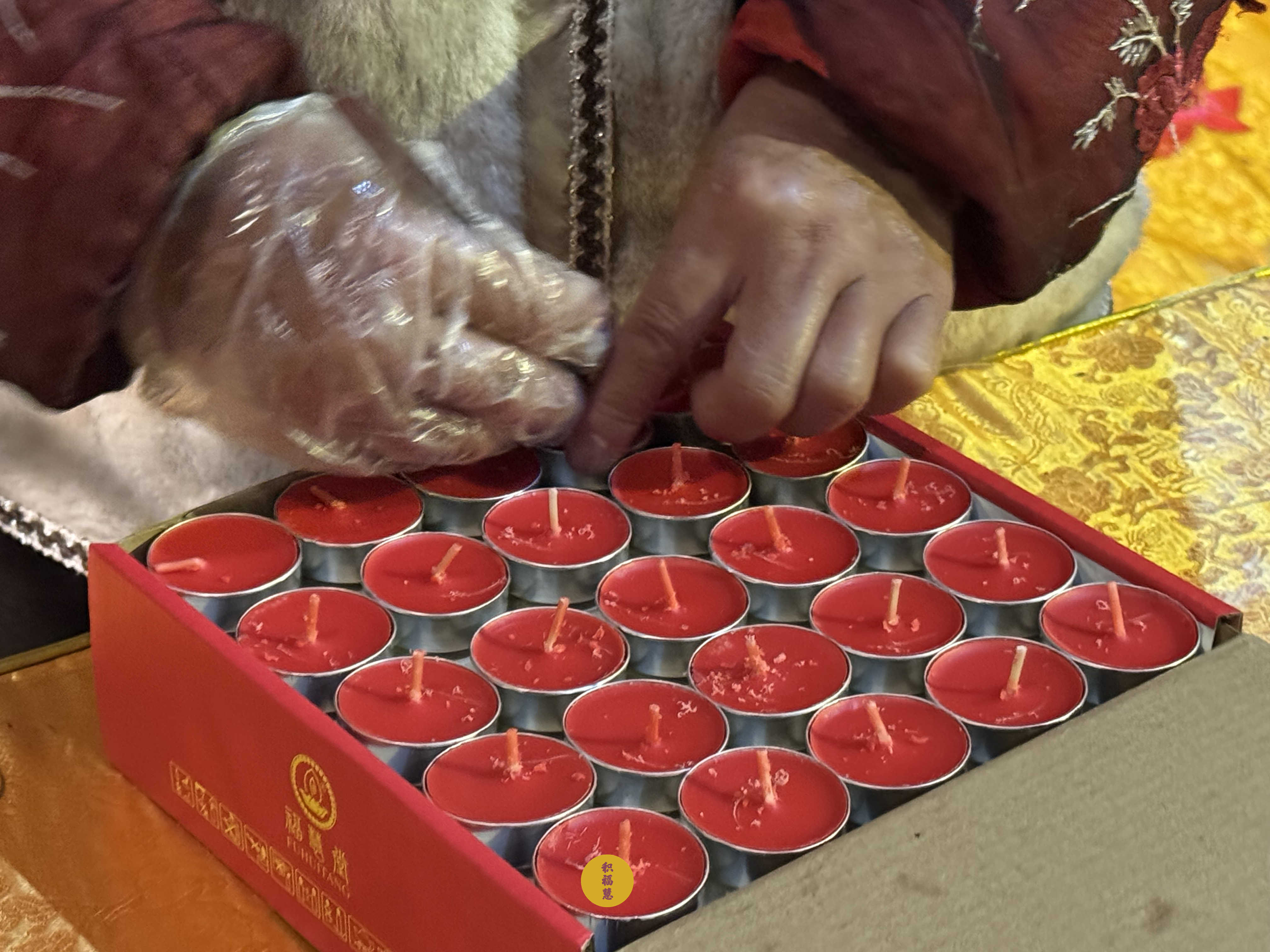 大雄宝殿内,义工先将酥油灯灯芯挑起,方便点灯。
