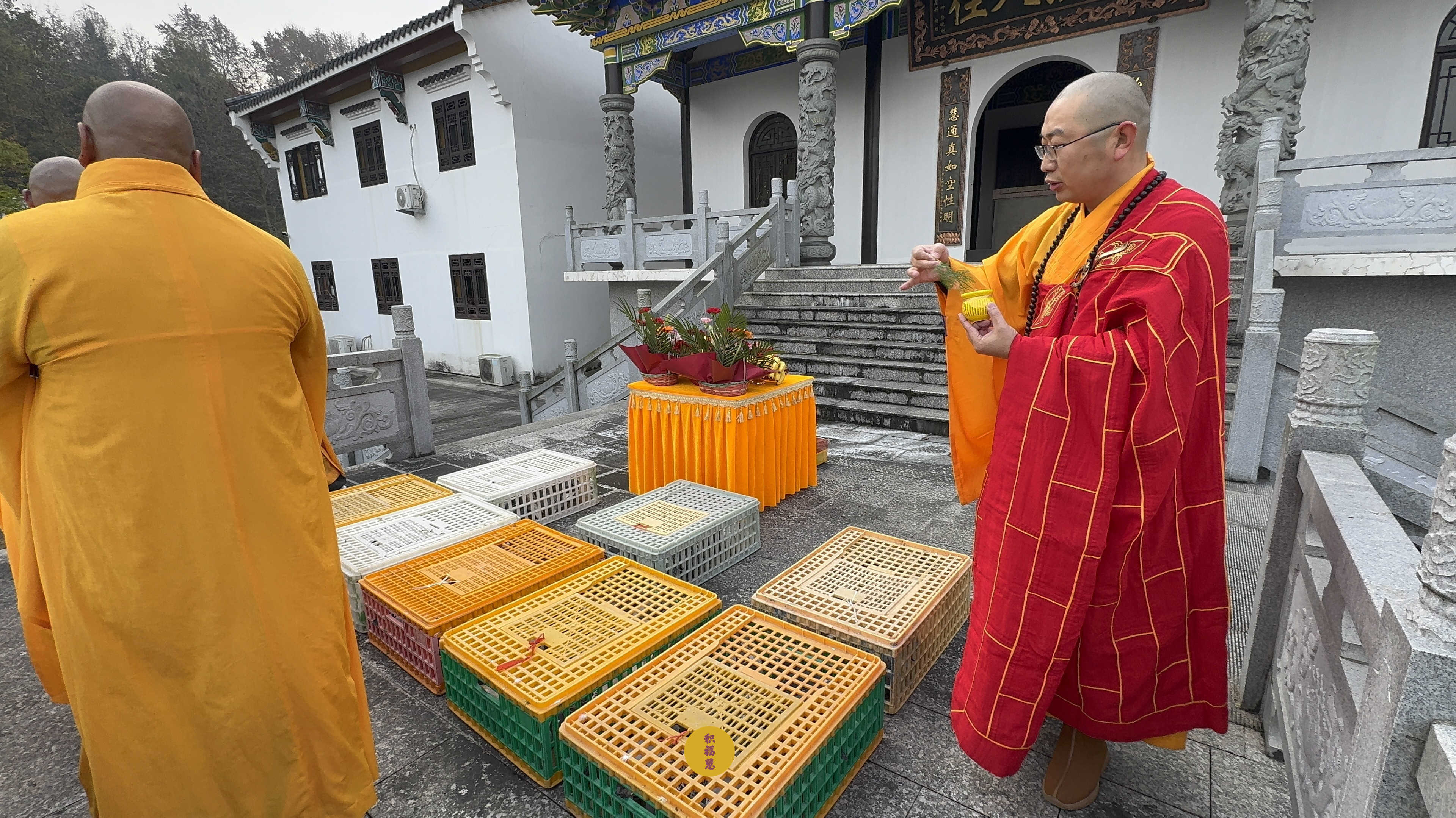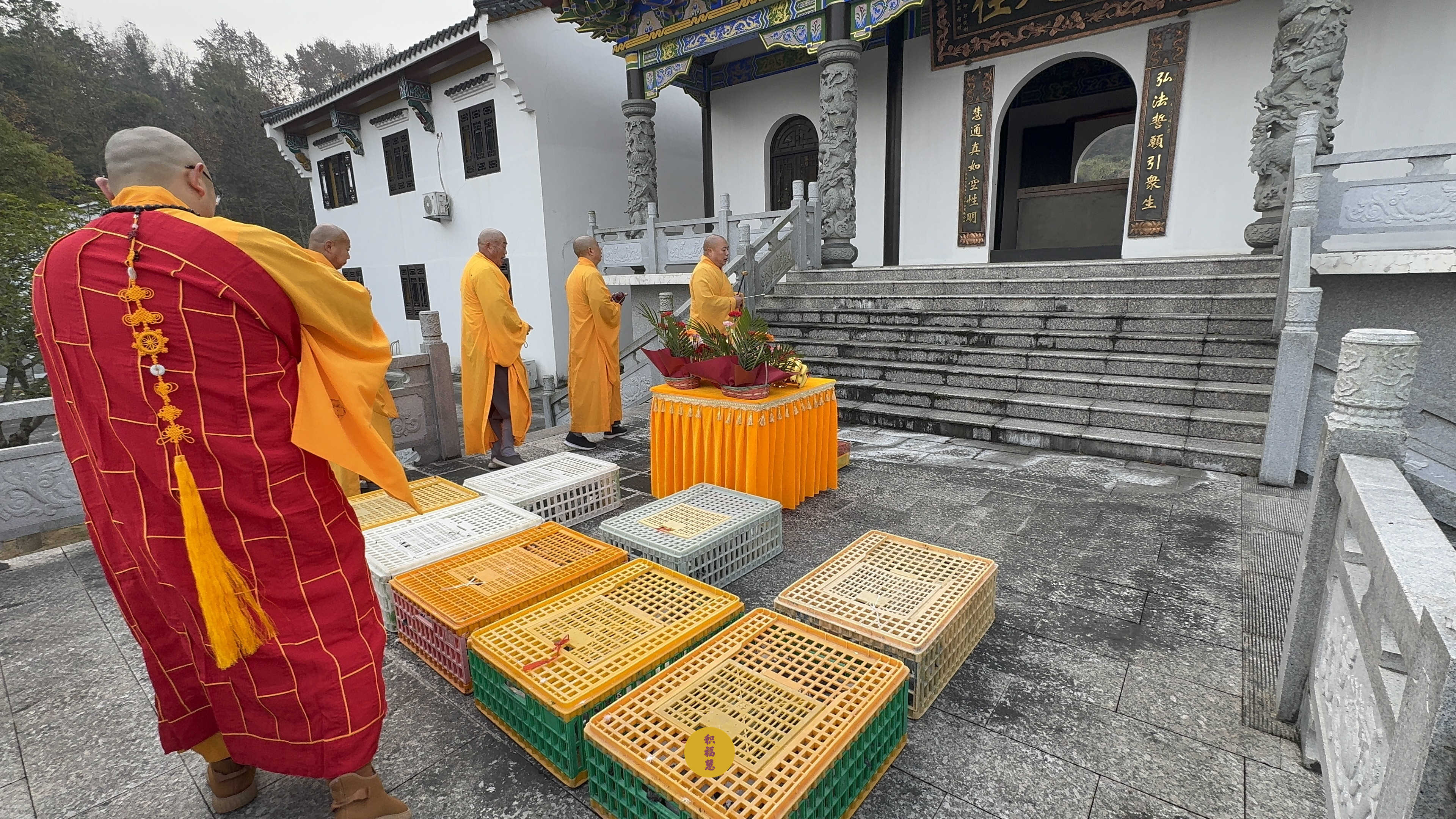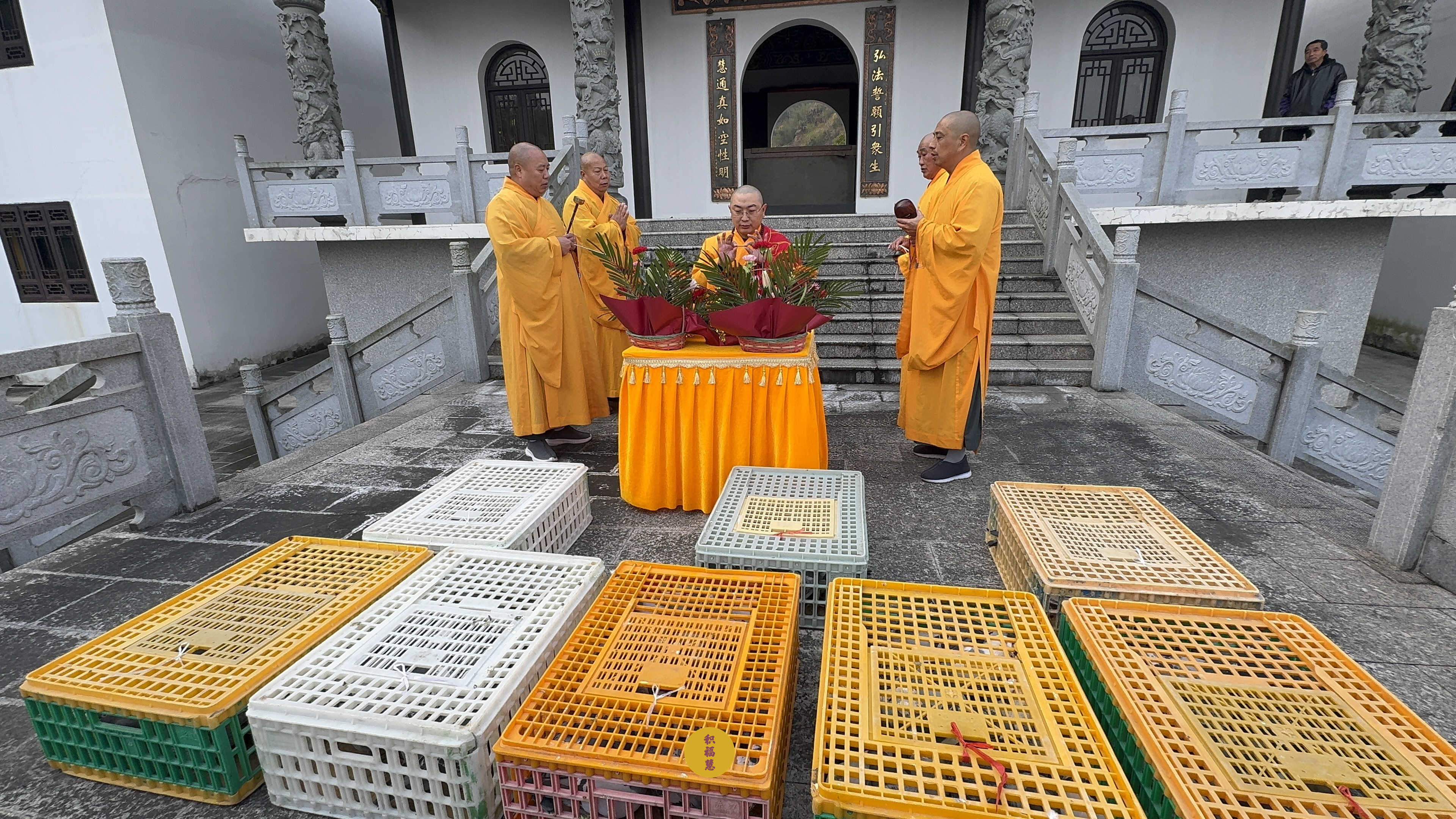 诸位法师依放生仪轨,诵大悲咒、心经,通过佛法加持,令诸飞禽众生仰仗佛力,不堕恶趣,转生善道。