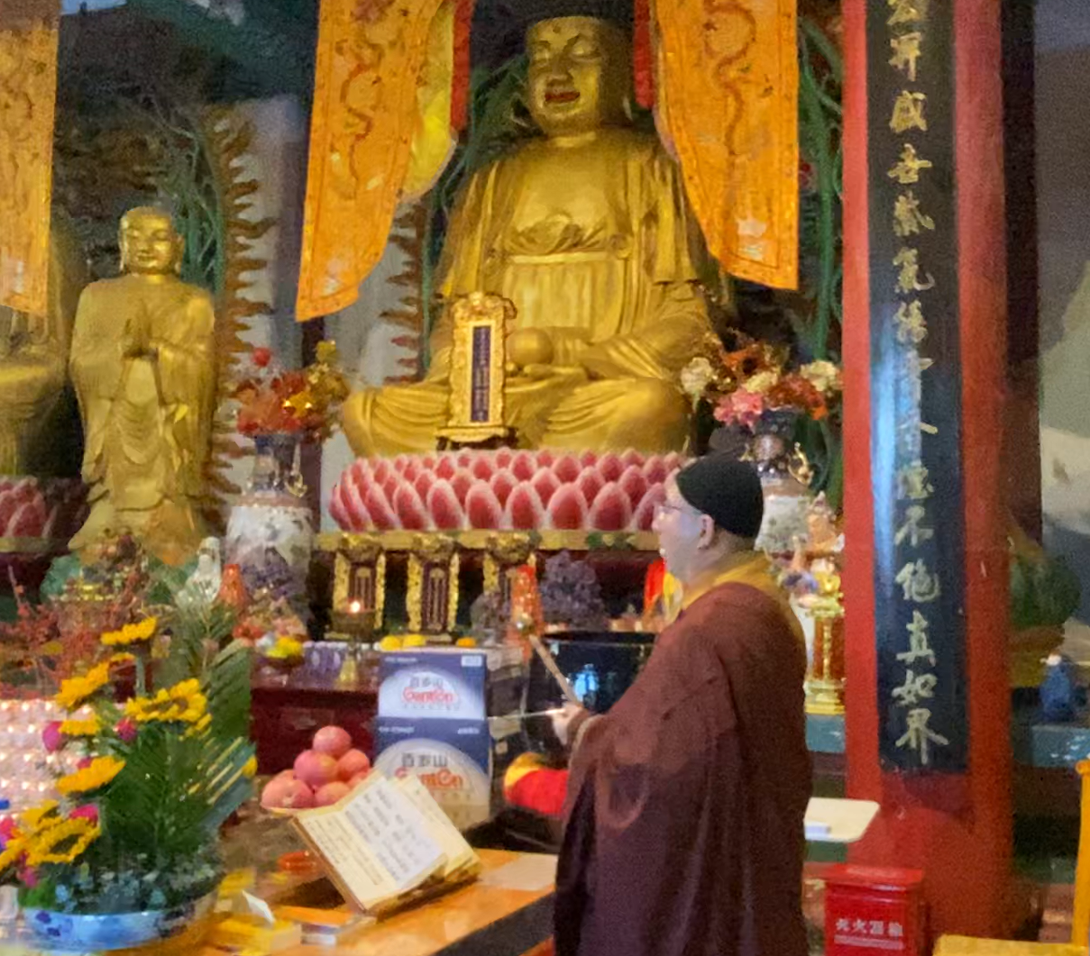 供灯完毕,下元节祝祷法会开始。大雄宝殿内香云袅袅,众法师和十方善信虔心礼诵,法喜充满。