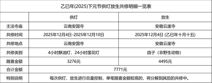 积福慧乙巳年(2025)下元节供灯放生共修自2025年11月21日启建,至2025年12月4日停止接收功德款,共计15天。