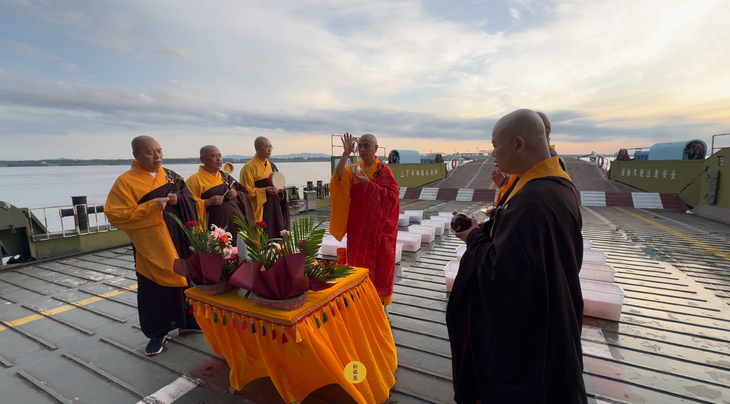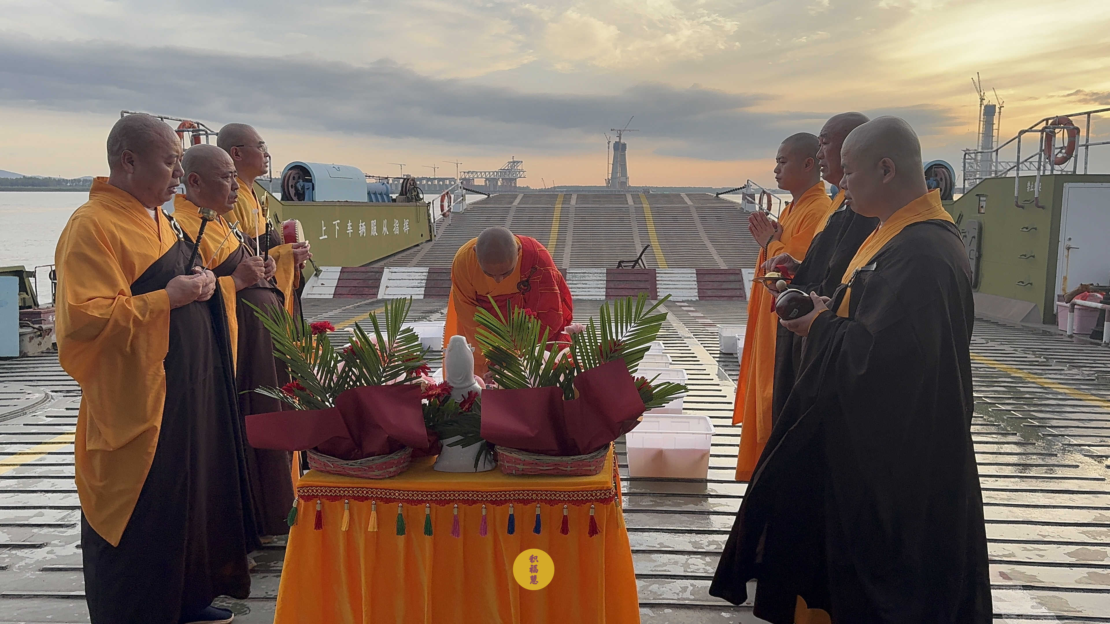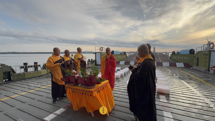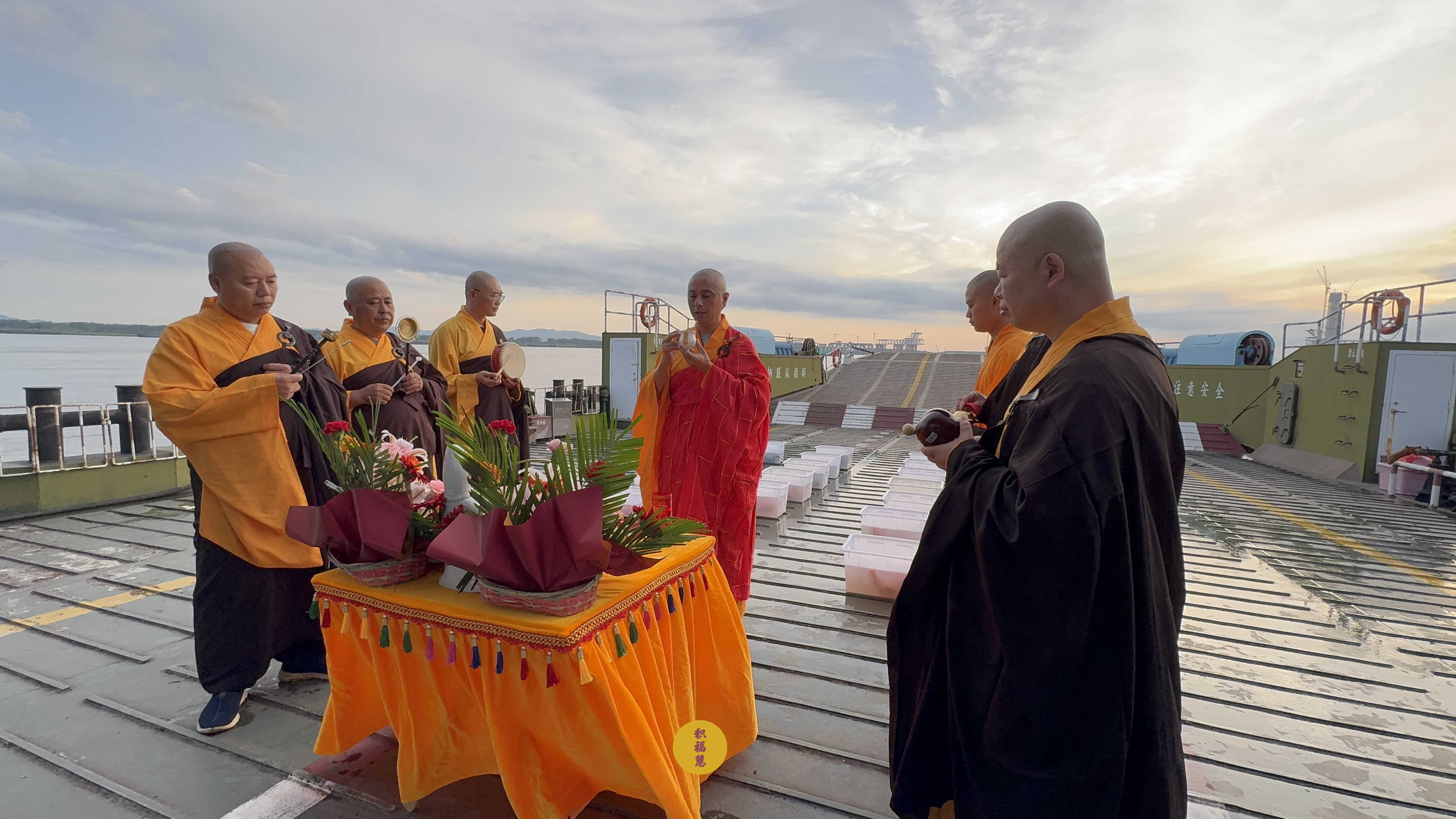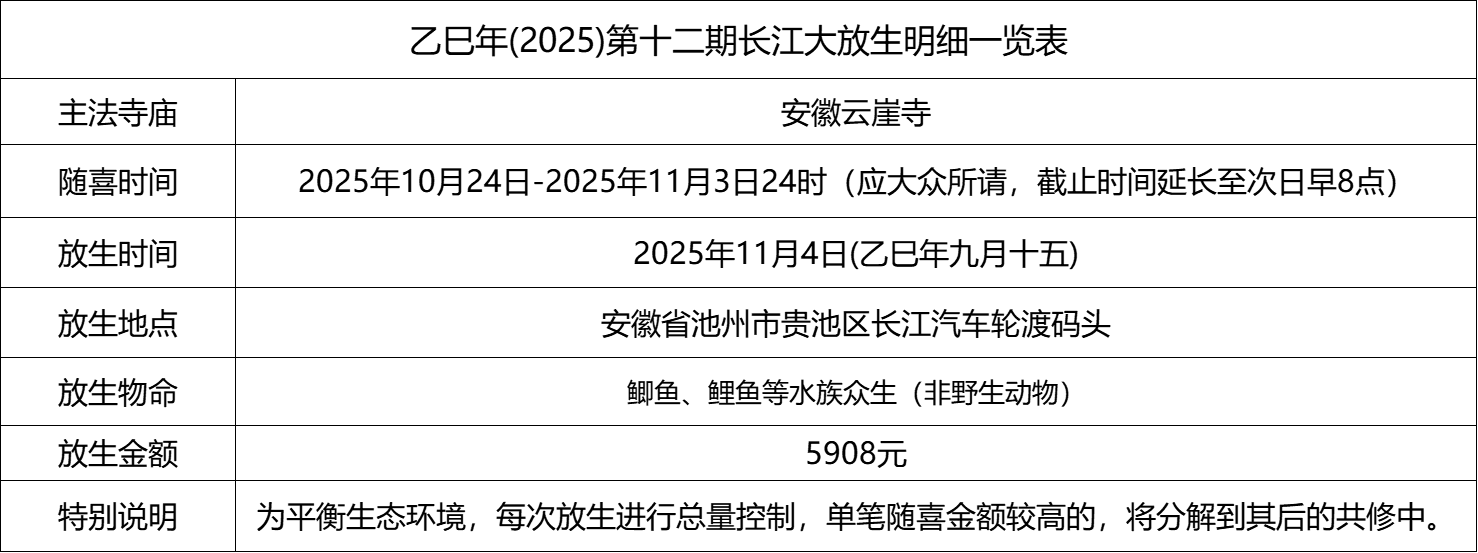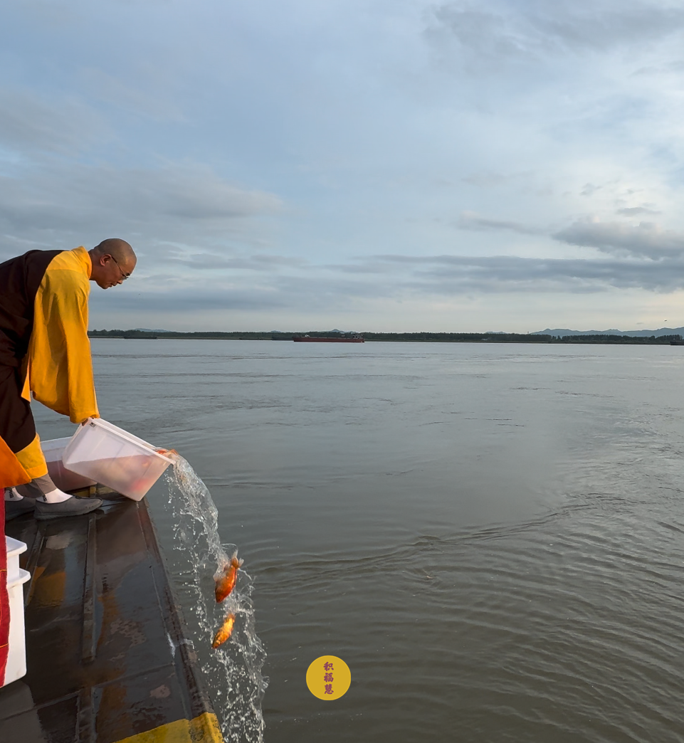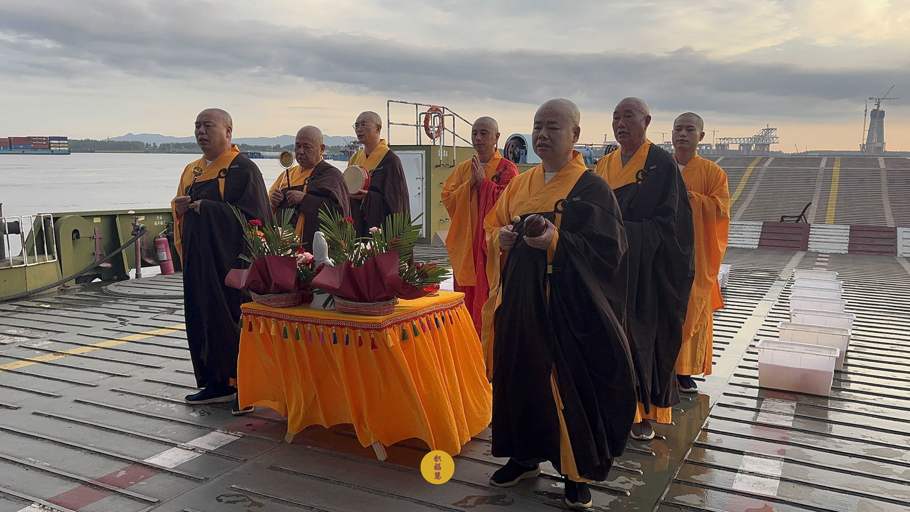 2025年11月4日,乙巳年九月十五,安徽云崖寺诸位法师在安徽省池州市贵池区长江汽车轮渡码头启建乙巳年第十二期长江放生法会,放生鲫鱼、鲤鱼等水族众生。