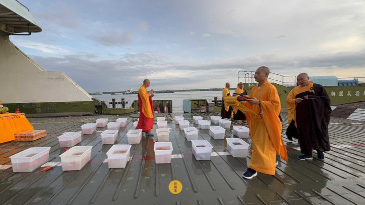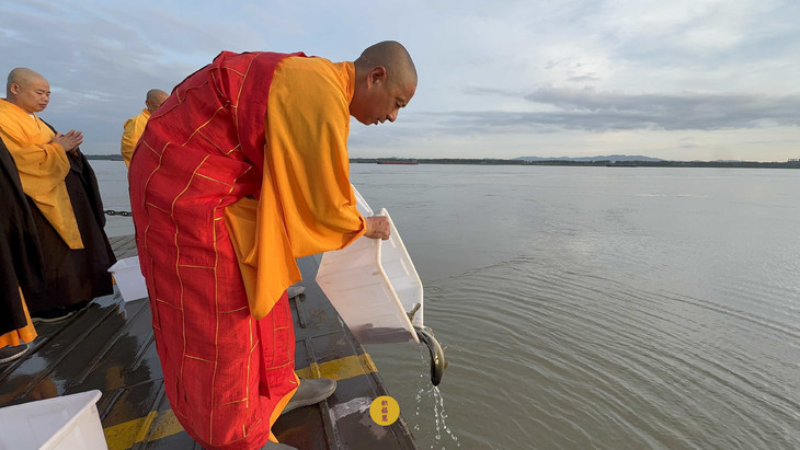 拈香、洒净、诵说水文,主法法师依放生仪轨如理如仪,为善信同修培植福德善缘,为被放物命种下解脱善根。