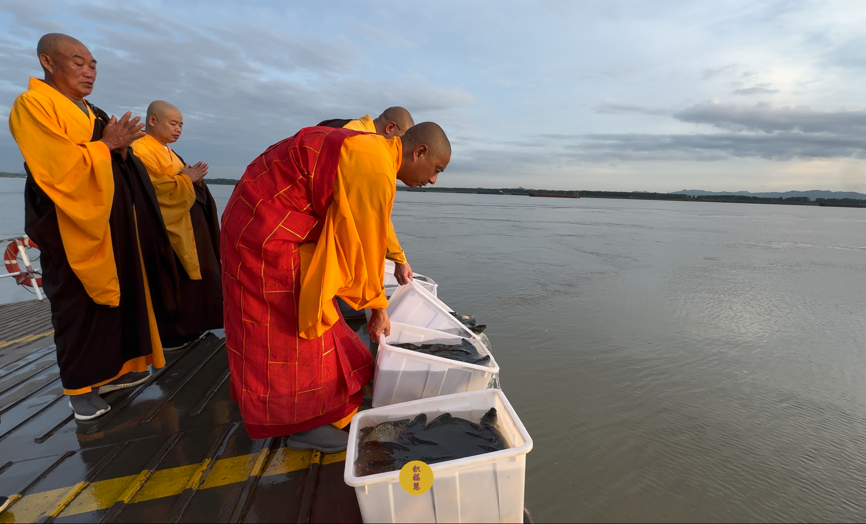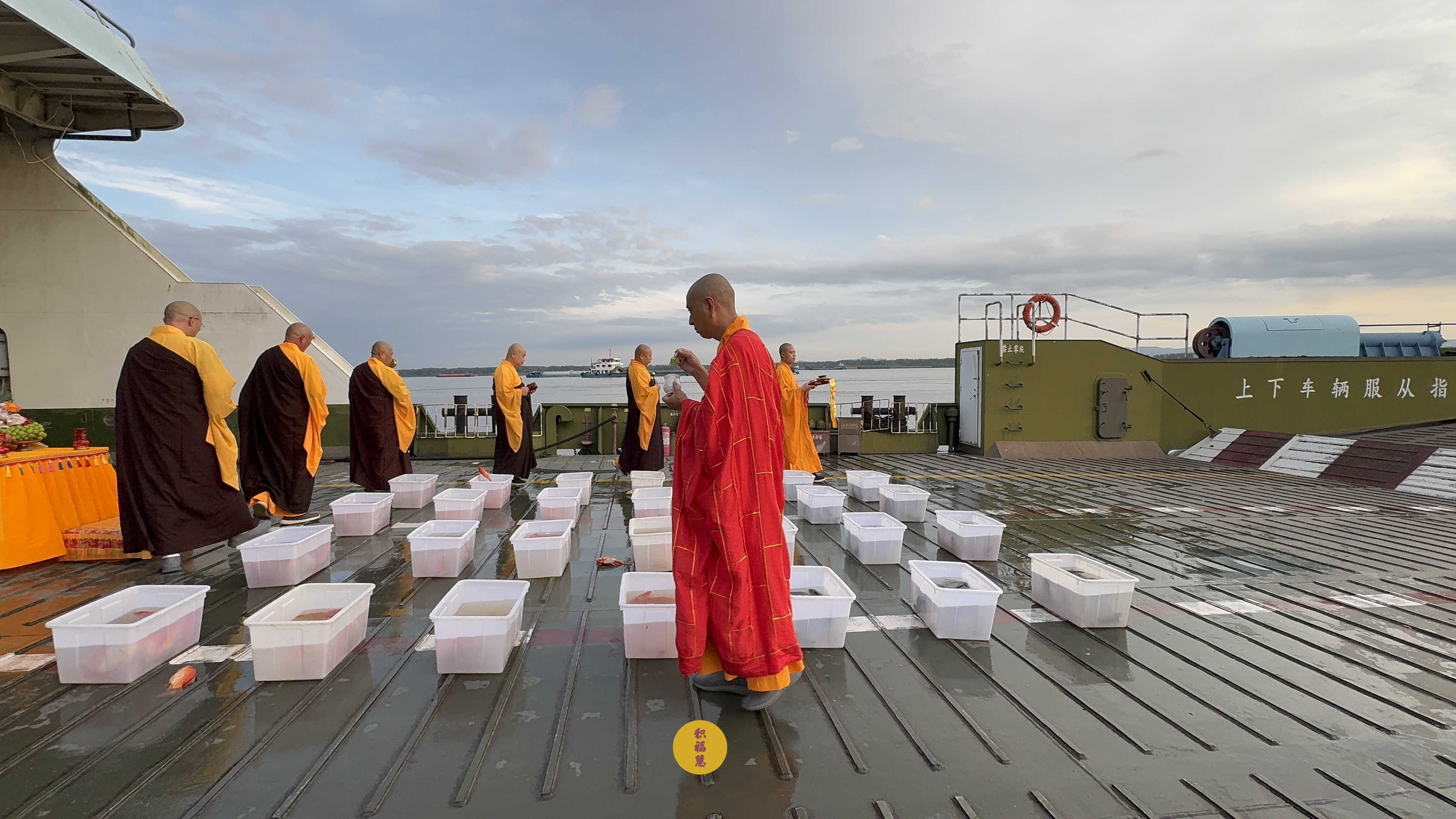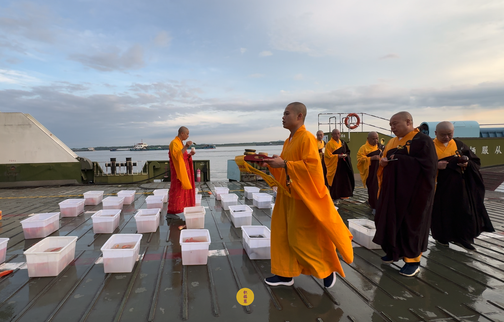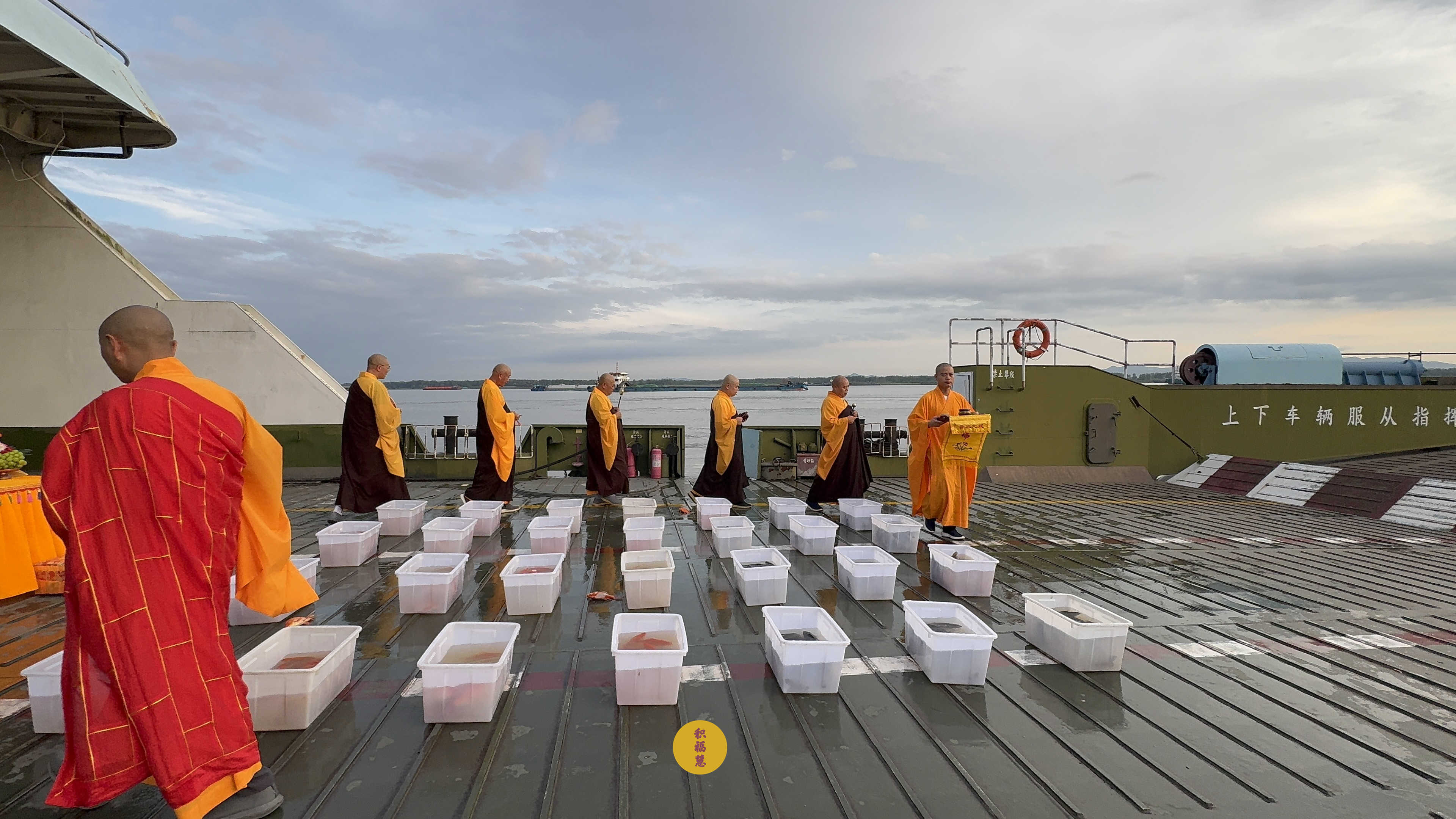 长江轮渡码头上,晨光初透,放生法会正式开始。