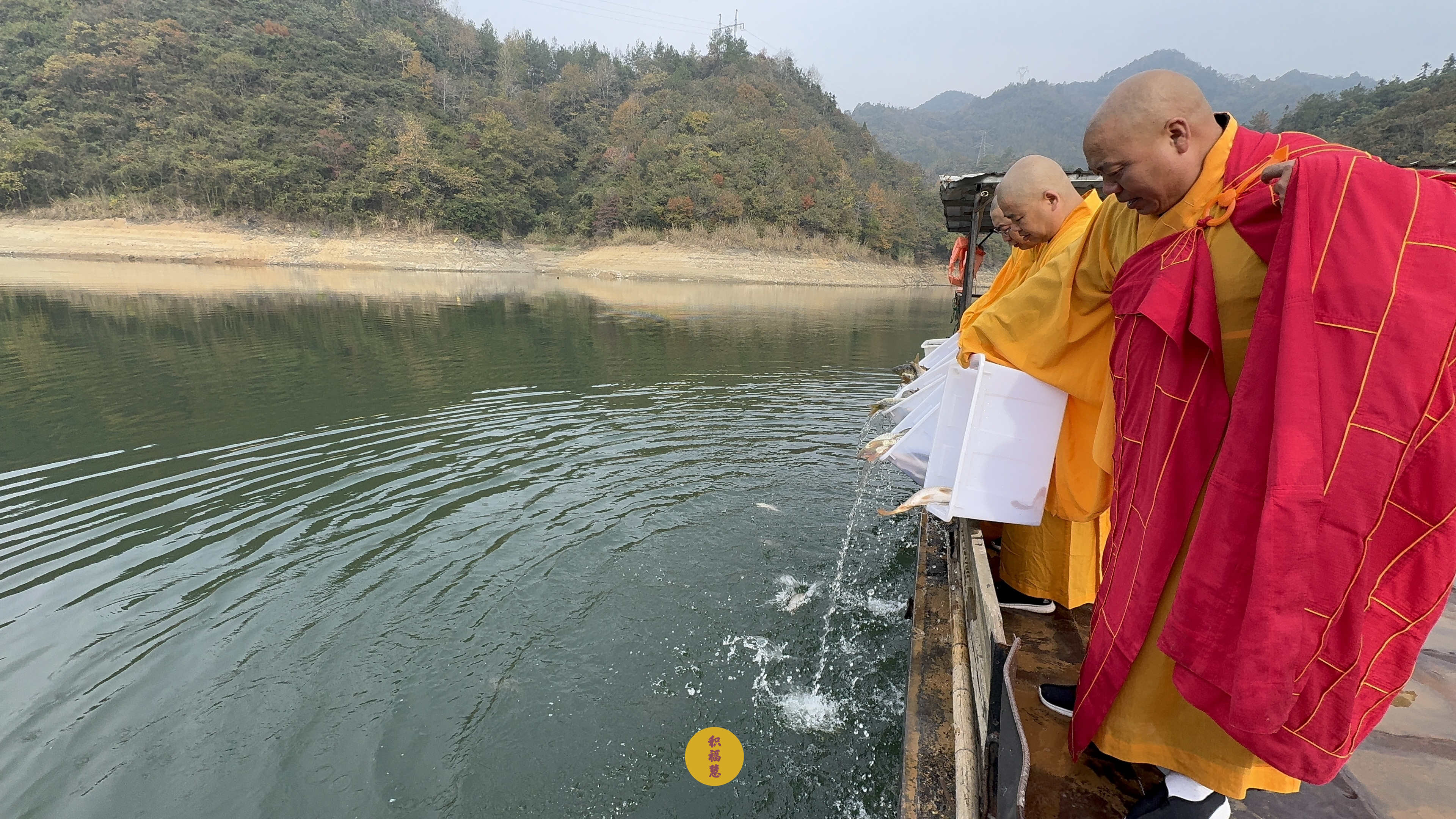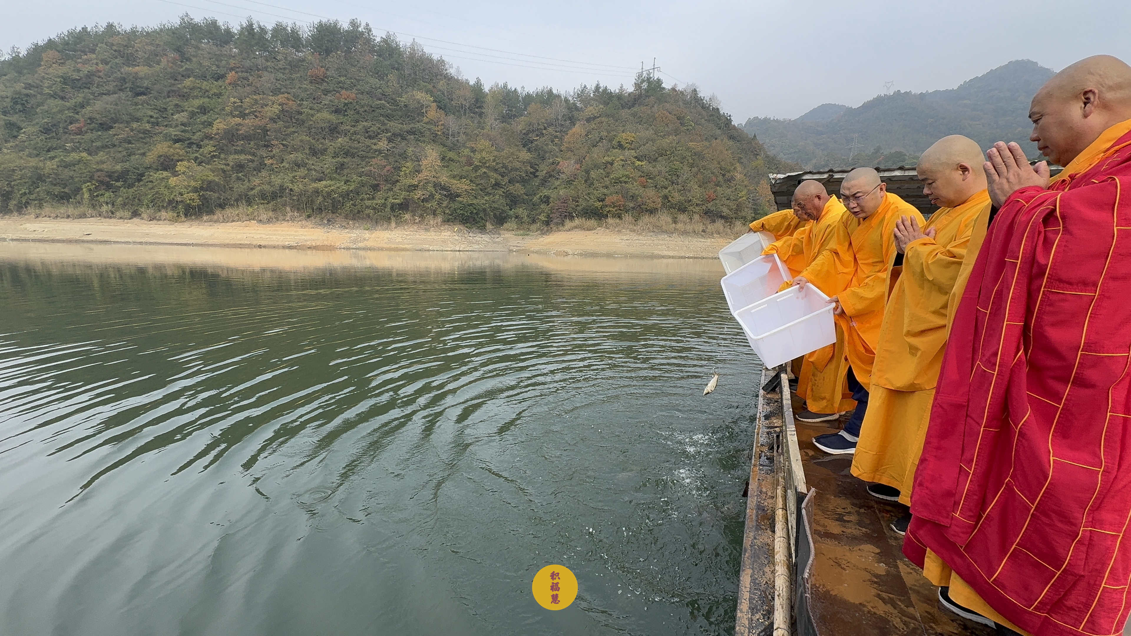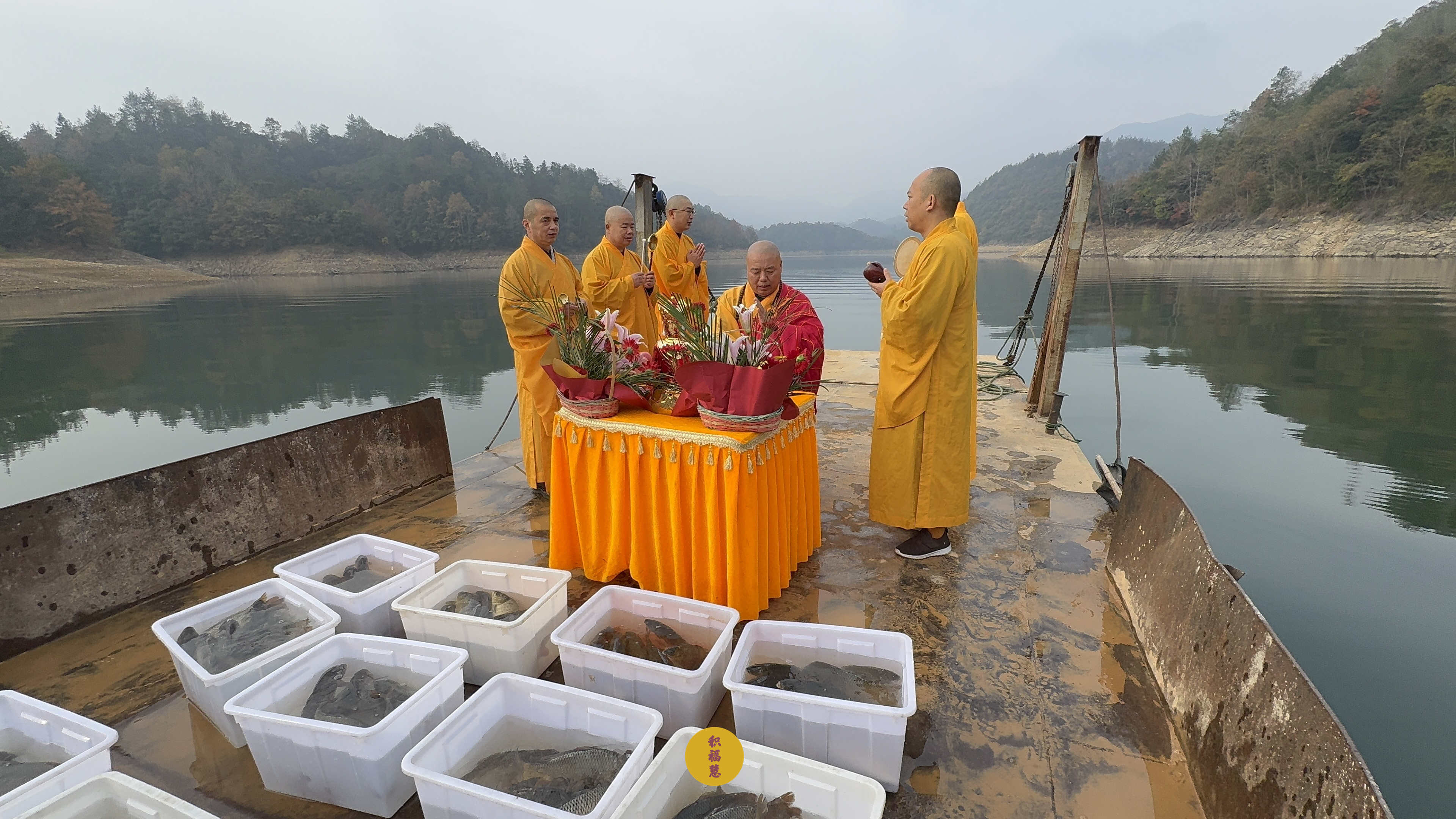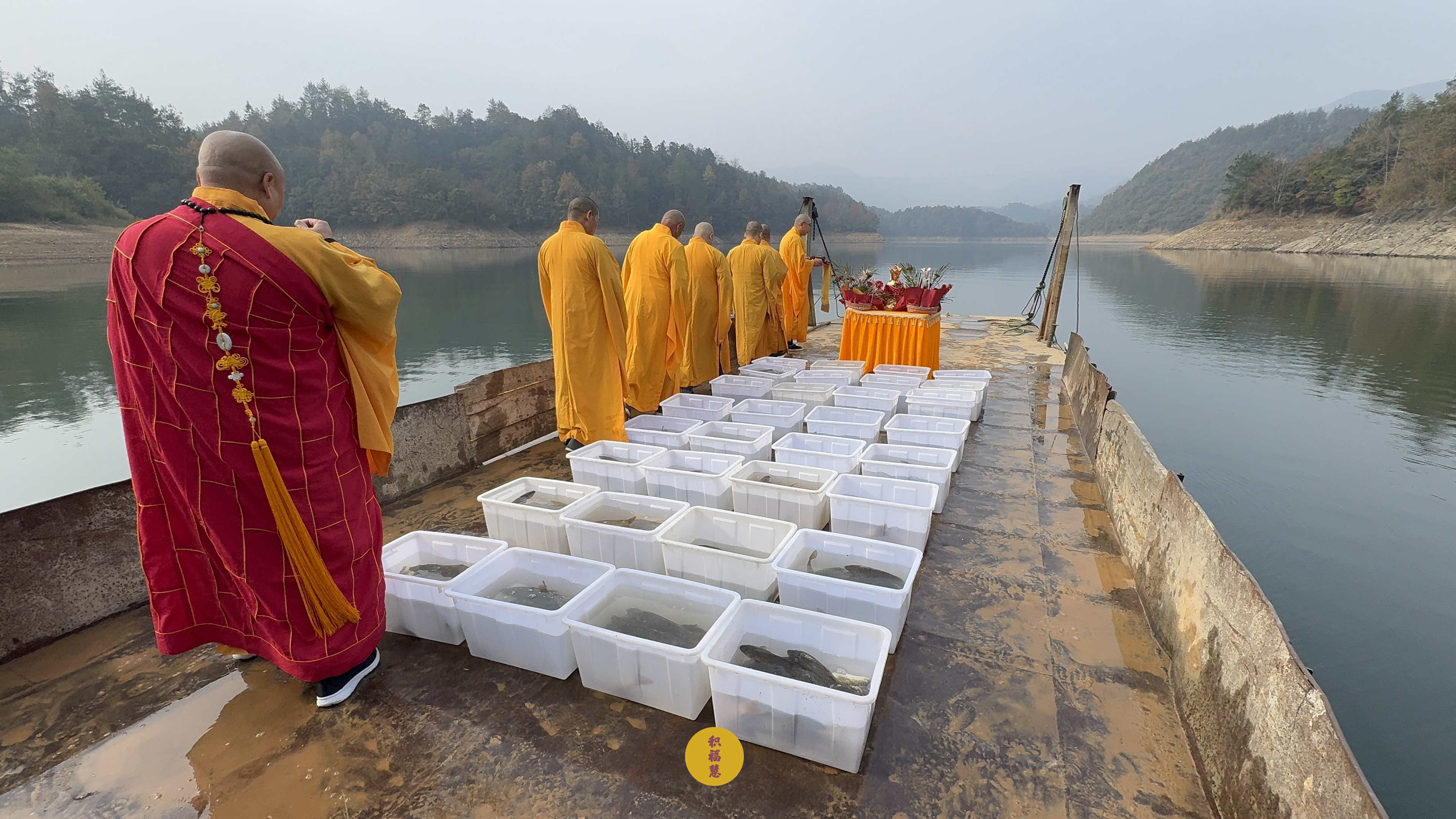 2025年12月20日,乙巳年冬月初一,安徽云崖寺诸位法师在安徽省黄山市太平湖风景区启建乙巳年第十三期放生法会,放生鲫鱼、鲤鱼等水族众生。