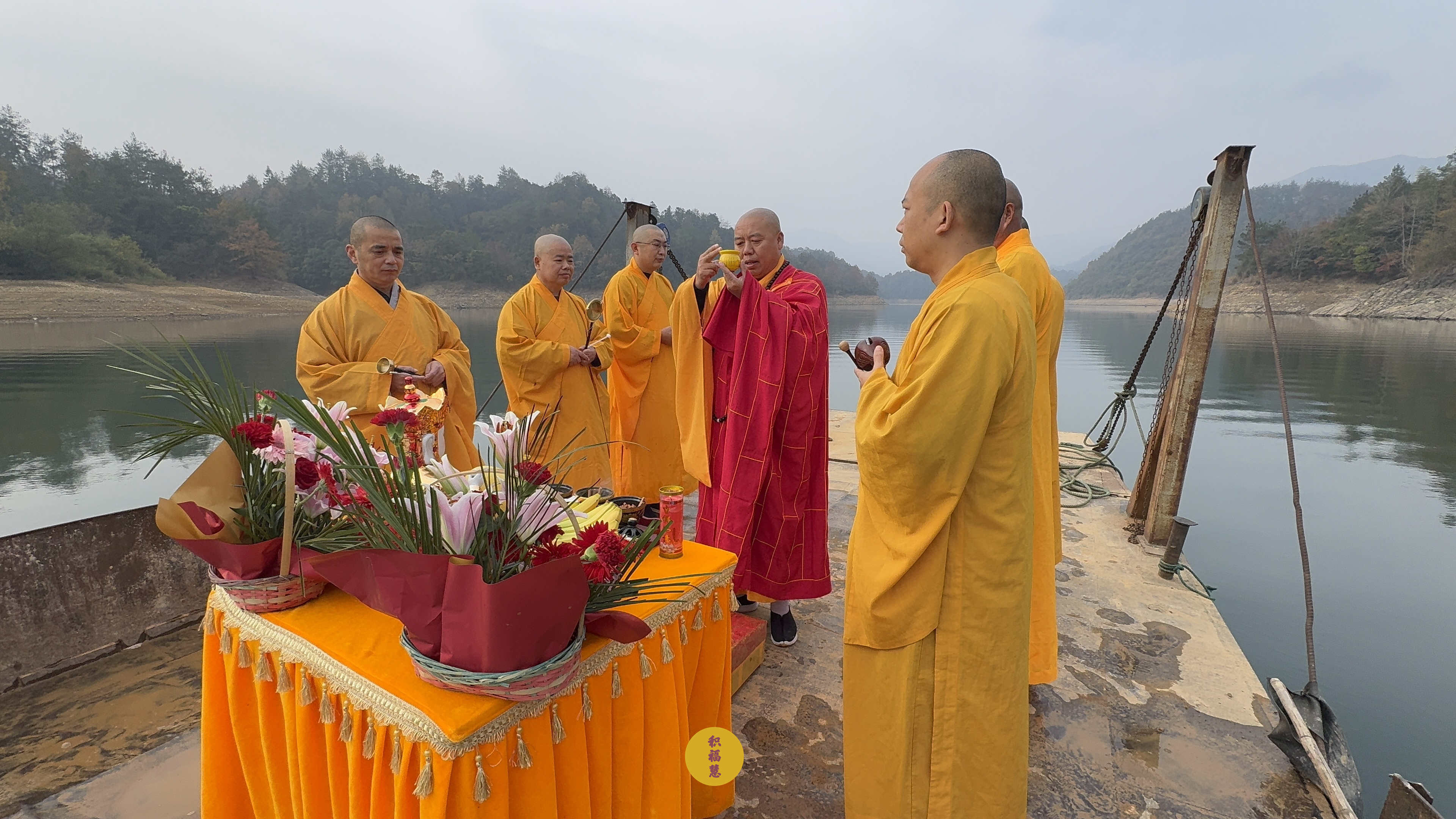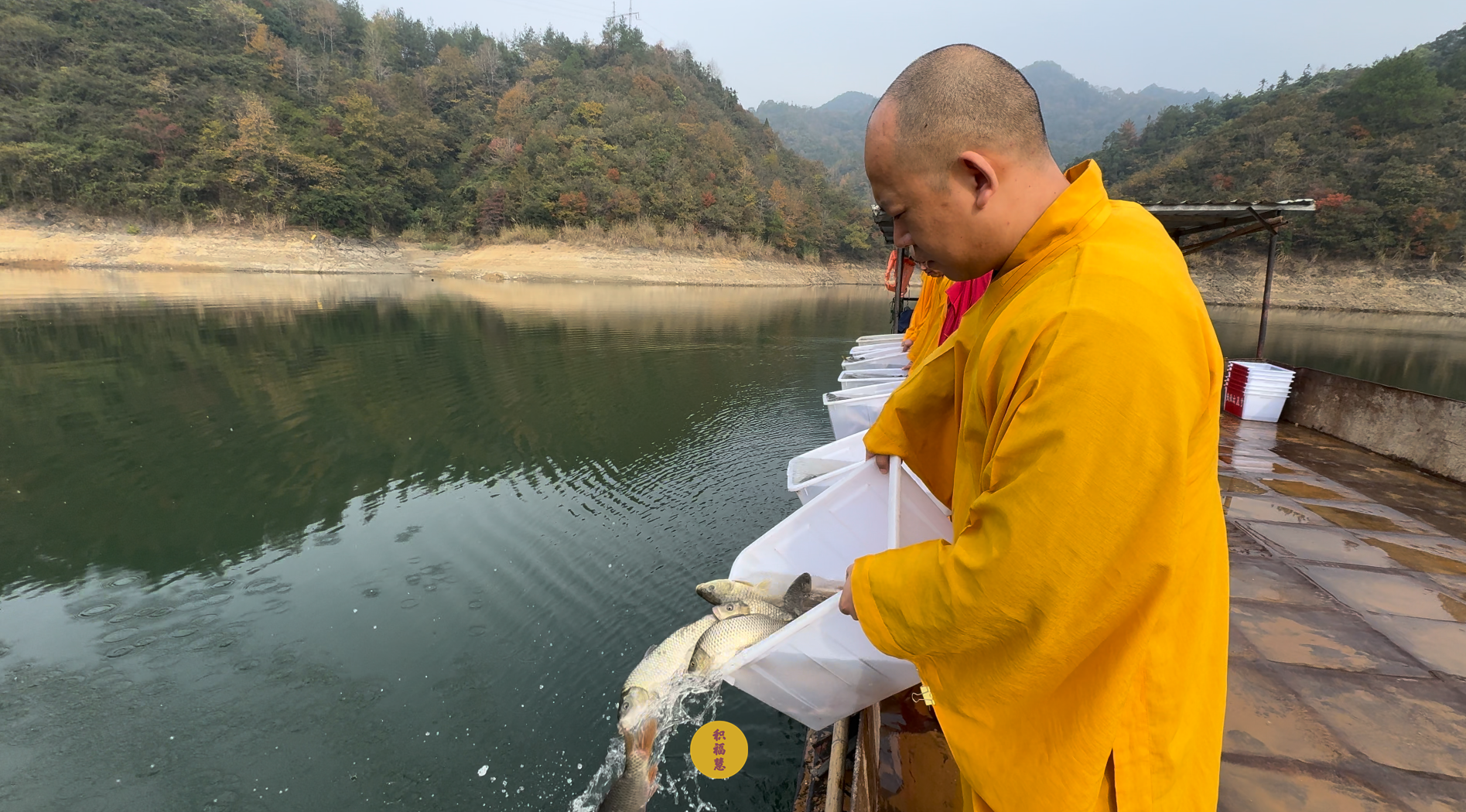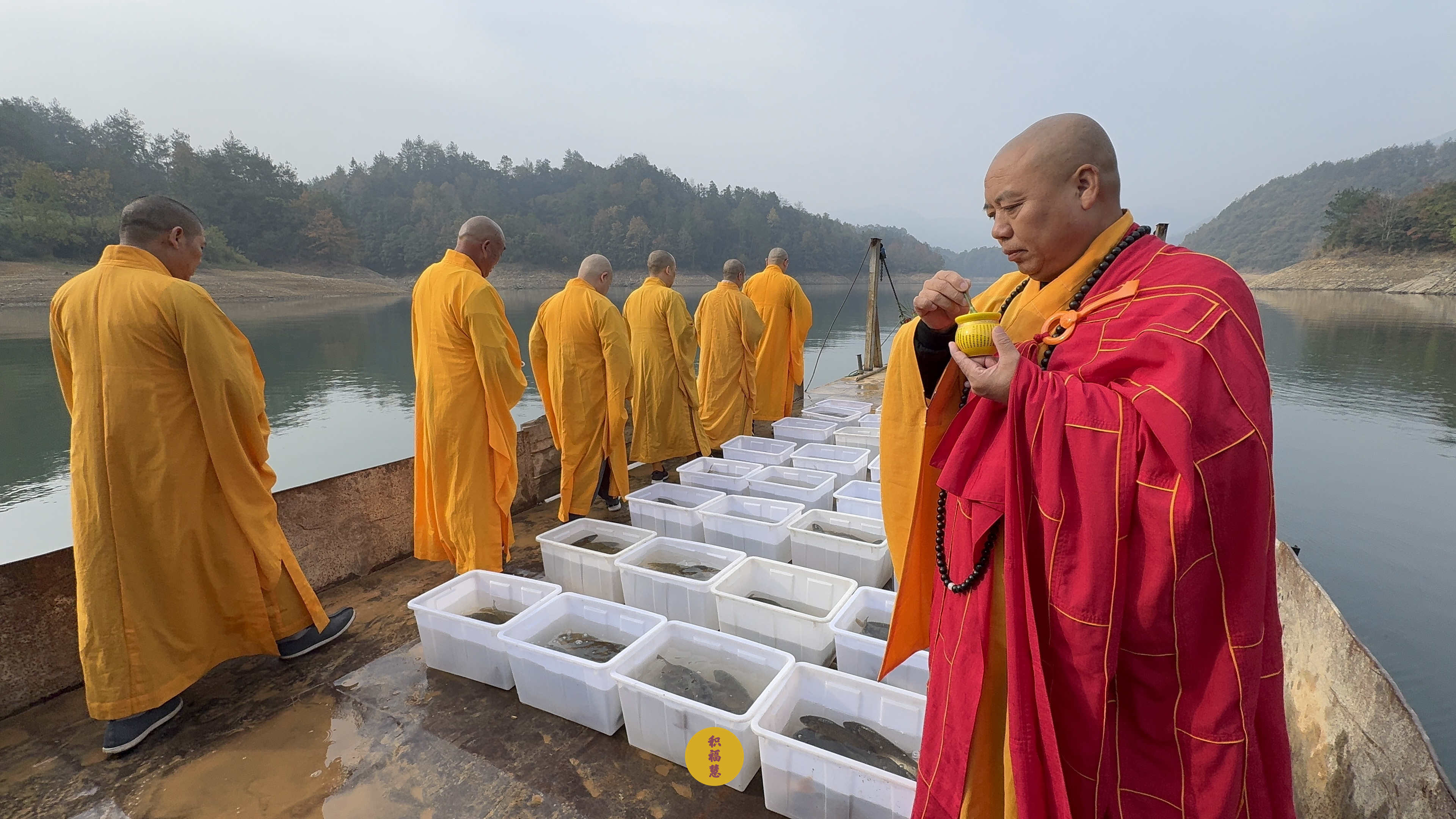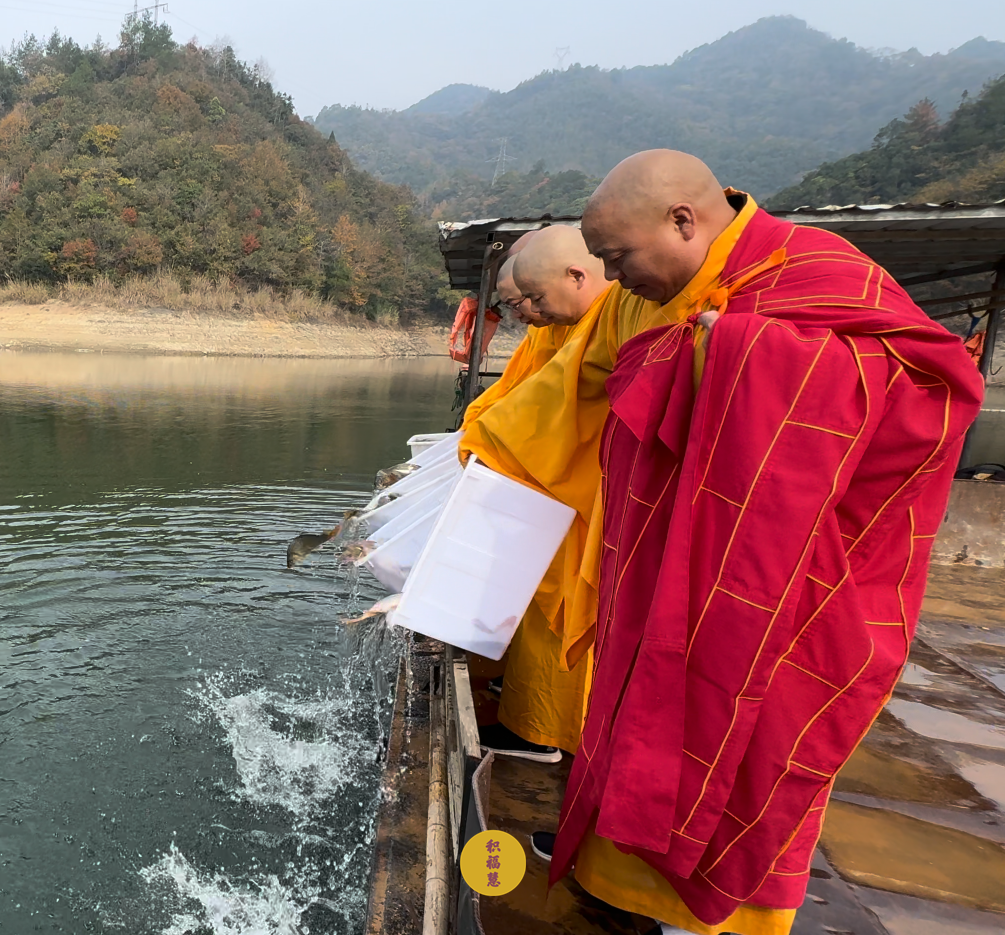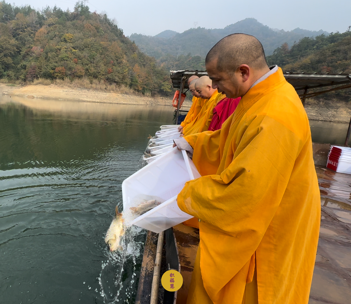 2025年12月20日,乙巳年冬月初一,安徽云崖寺诸位法师在安徽省黄山市太平湖风景区启建乙巳年第十三期放生法会,放生鲫鱼、鲤鱼等水族众生。