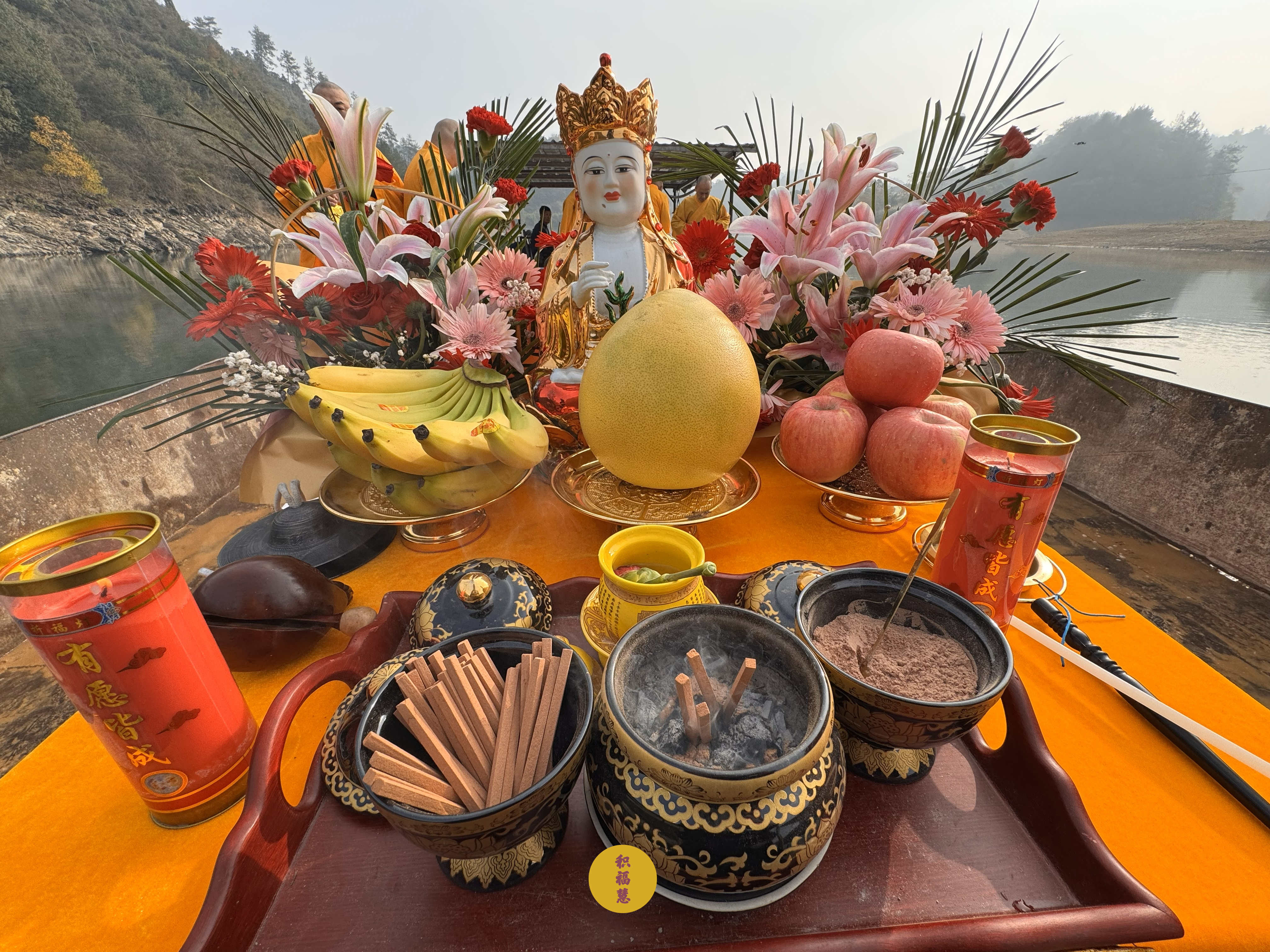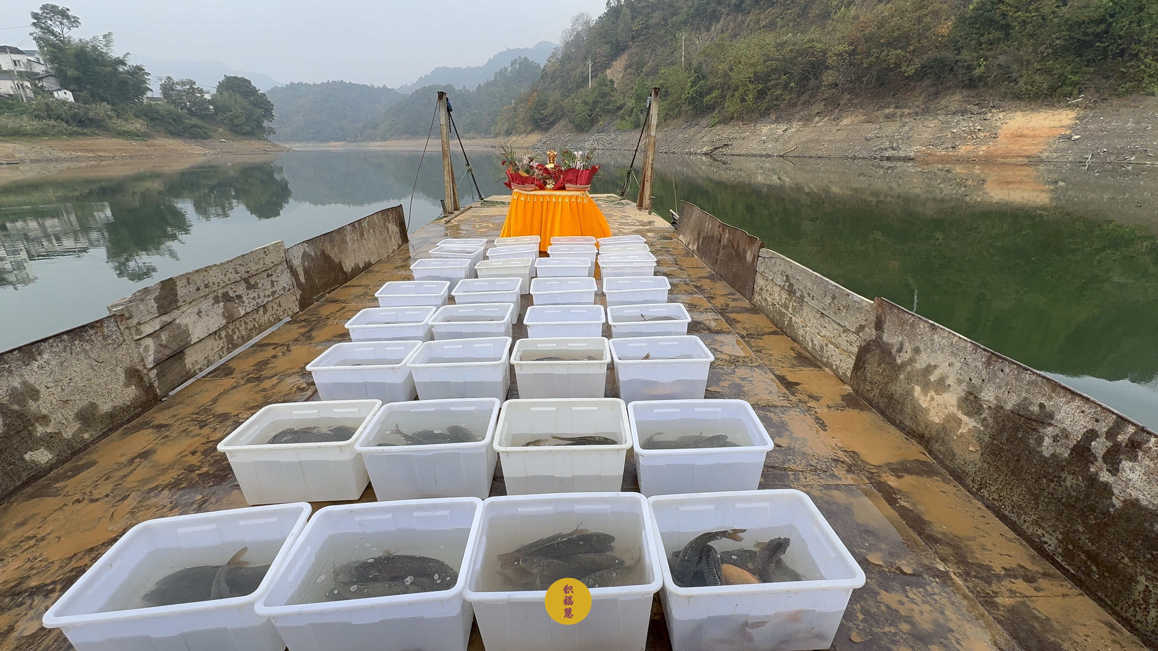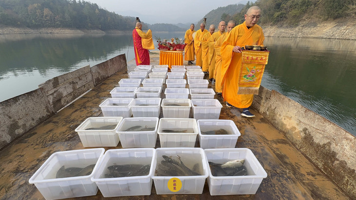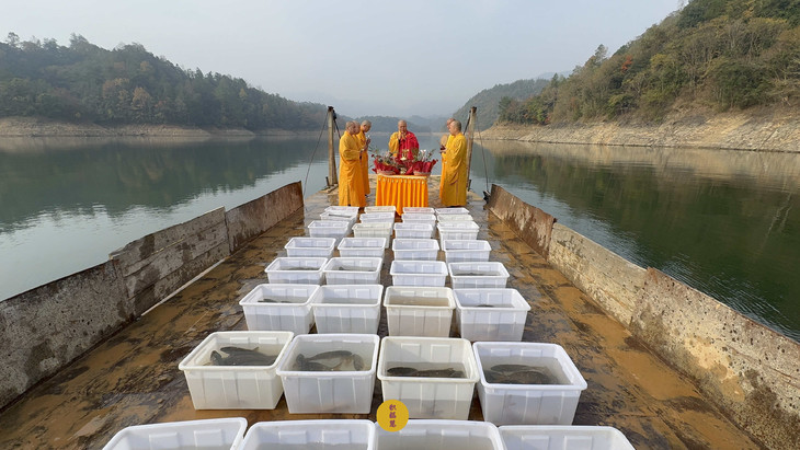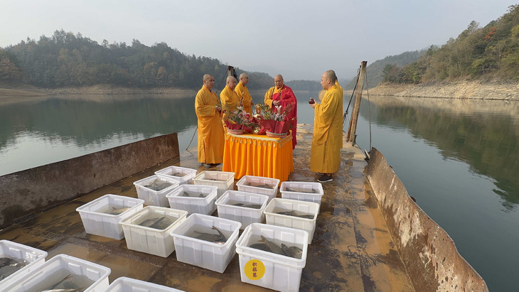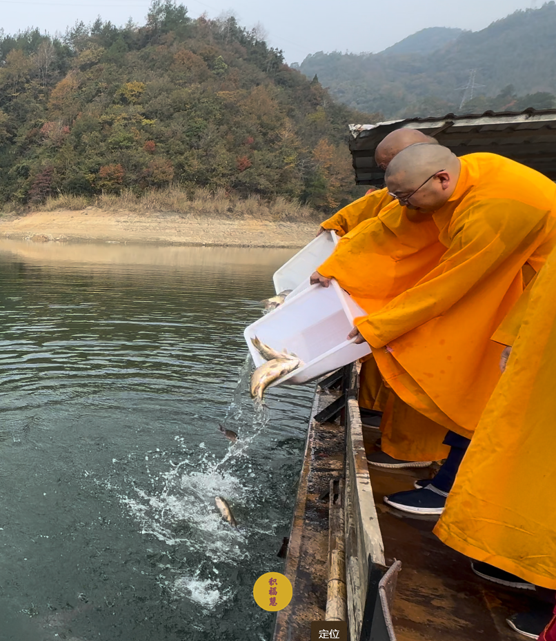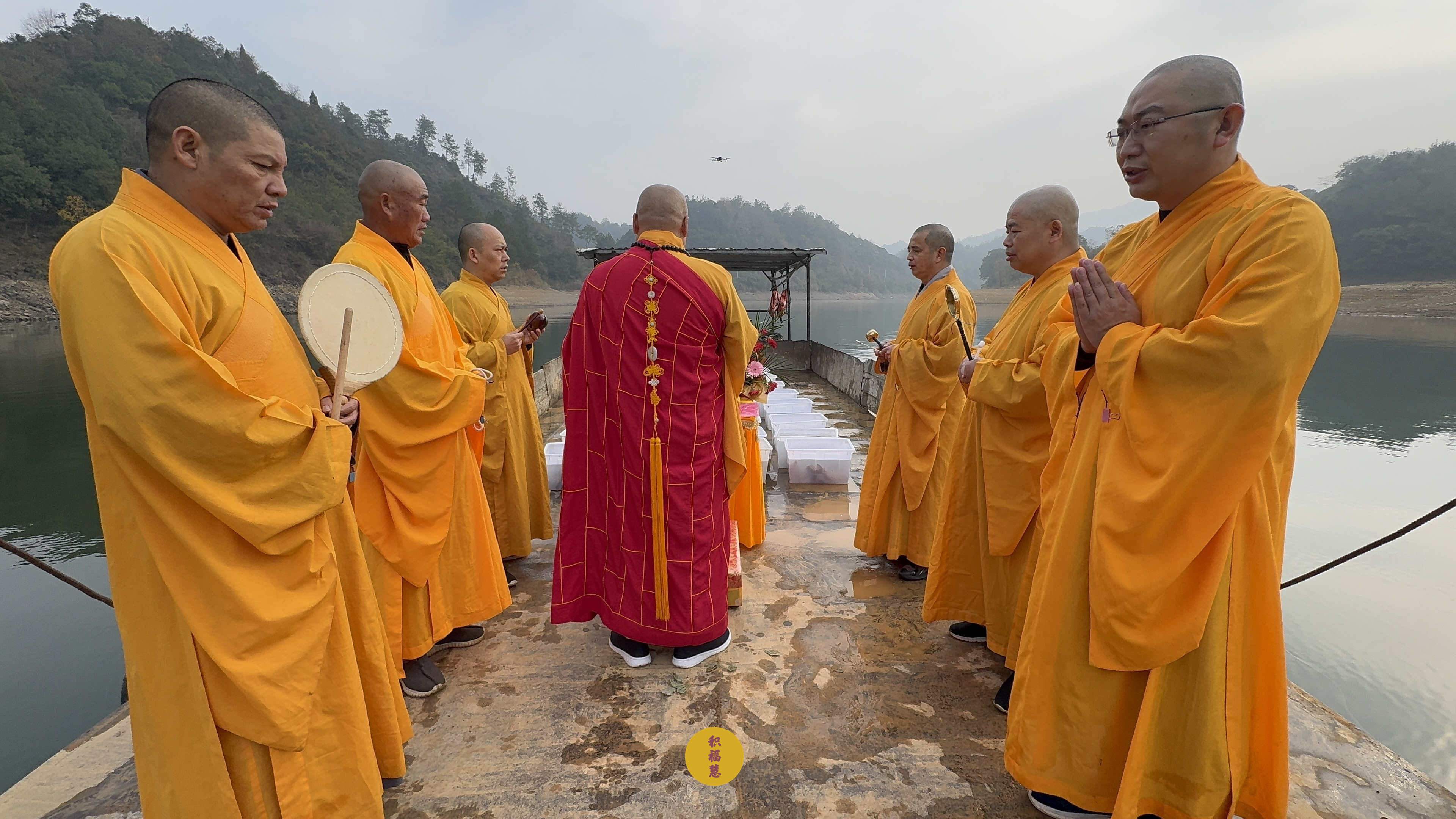 2025年12月20日,乙巳年冬月初一,安徽云崖寺诸位法师在安徽省黄山市太平湖风景区启建乙巳年第十三期放生法会,放生鲫鱼、鲤鱼等水族众生。