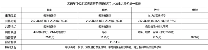 积福慧乙巳年观世音菩萨圣诞供灯供水放生共修自2025年2月18日启建,至2025年3月18日23时停止接收功德款,共计29天。