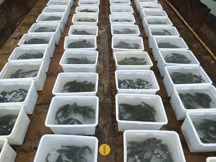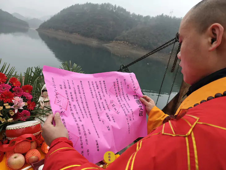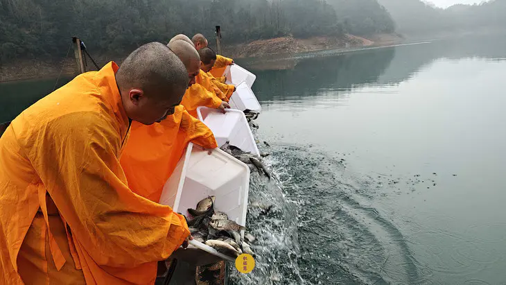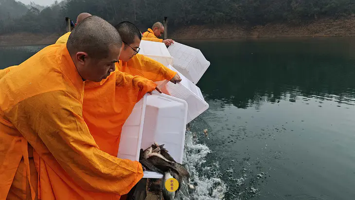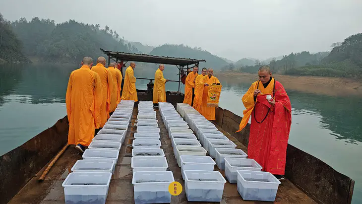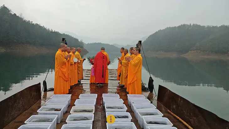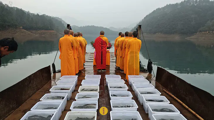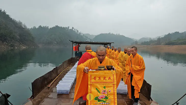 安徽池州太平湖上,驳船载着待放生物行至湖中央。主法法师依照放生仪轨,拈香洒净。
