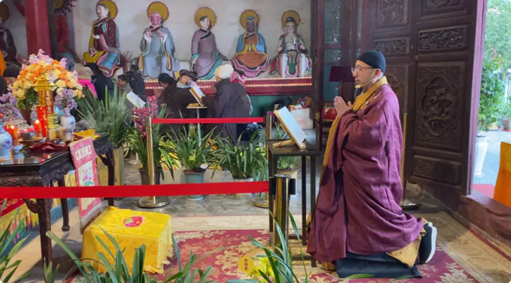 观世音菩萨圣诞祝祷法会开始。主法法师拈香礼佛,共修《观世音菩萨普门品》,祈愿菩萨慈航普度,不舍娑婆。
