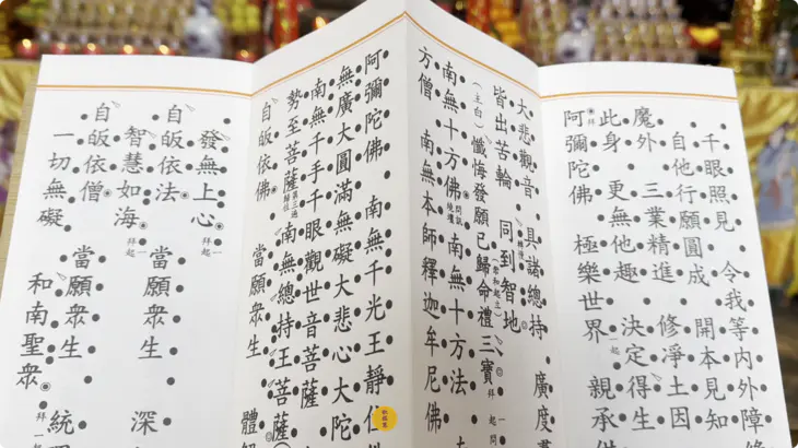 诵《放生功德文疏》。一愿世界和平,刀兵永息;二愿众生离苦,病厄消散;三愿正法久住,佛灯长明;四愿效观音耳根圆通,返闻自性,早证菩提。