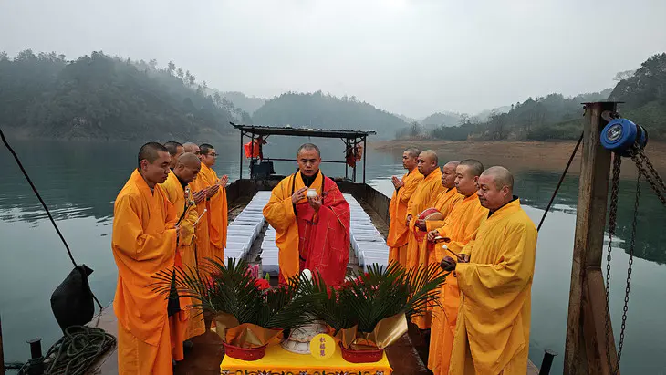 2025年3月18日,乙巳年二月十九,云南安国寺启建观世音菩萨圣诞供灯供水法会,如理如法按次第起供,至2025年3月24日供圆满。同日,九华山西来禅寺诸位法师在安徽省池州市太平湖启建放生法会,放生鲫鱼、鲤鱼、泥鳅等水族众生。