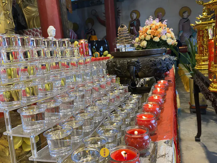 安国寺大雄宝殿内,十方善信在法师引导下,一边称念观世音菩萨圣号,一边摆灯、点灯。