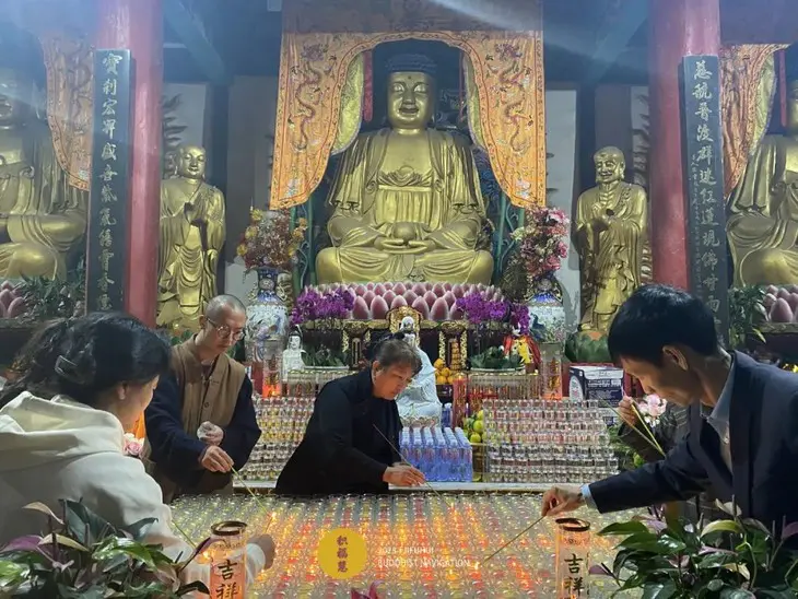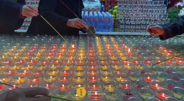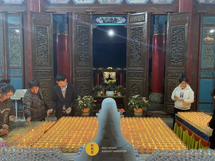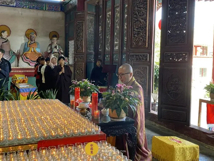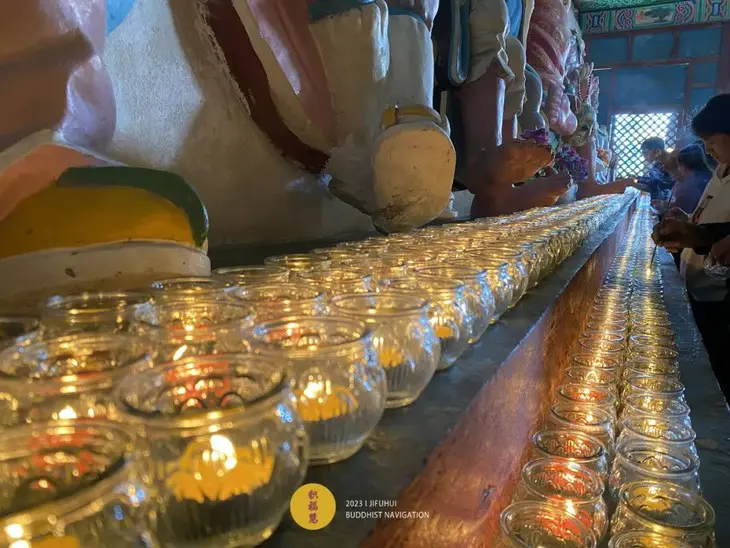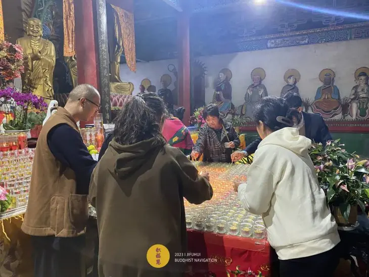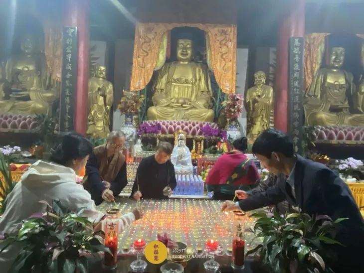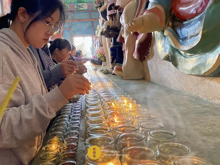 法师与善信同修屏息正意,共同燃起佛前灯。