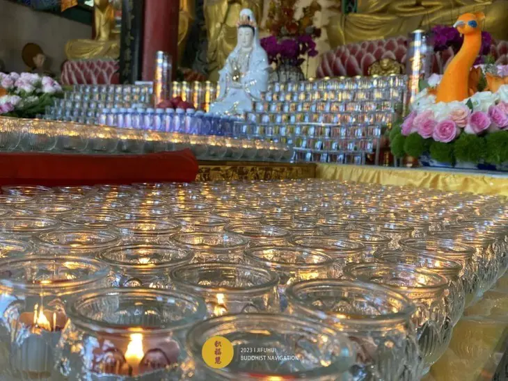 于观世音菩萨前虔诚供灯供水,所得之功德,悉与一切众生共之。以是因缘,令诸众生,光明无量,欢喜无量。