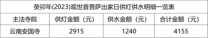 积福慧癸卯年观世音菩萨出家日共修自2023年10月25日启建,至2023年11月2日23时停止接收功德款,共计9天。同修随喜供灯款3510元,供水款1656元,放生款8155元。
