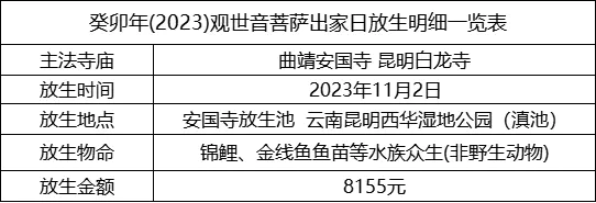 同日,曲靖安国寺在安国寺放生池中放生锦鲤等水族众生,昆明白龙寺诸位法师在云南昆明西华湿地公园(滇池)放生金线鱼鱼苗等水族众生(非野生动物),金额合计8155元。