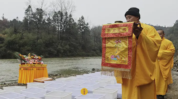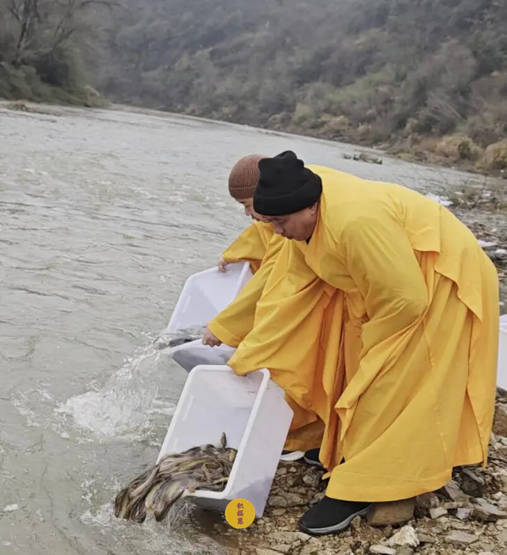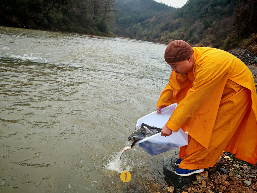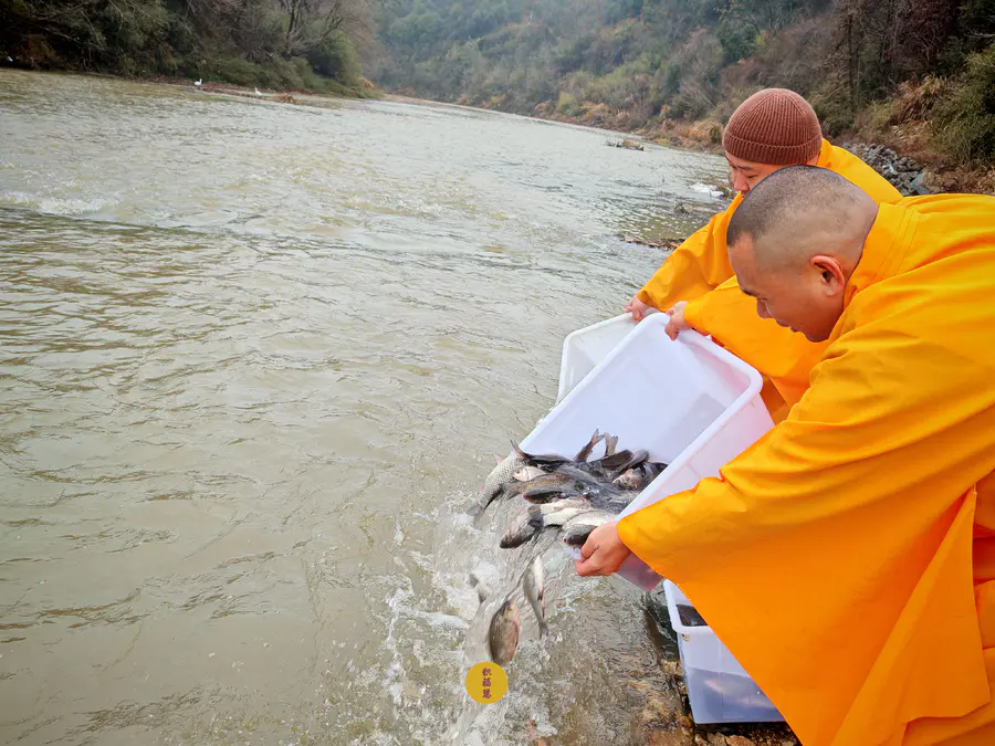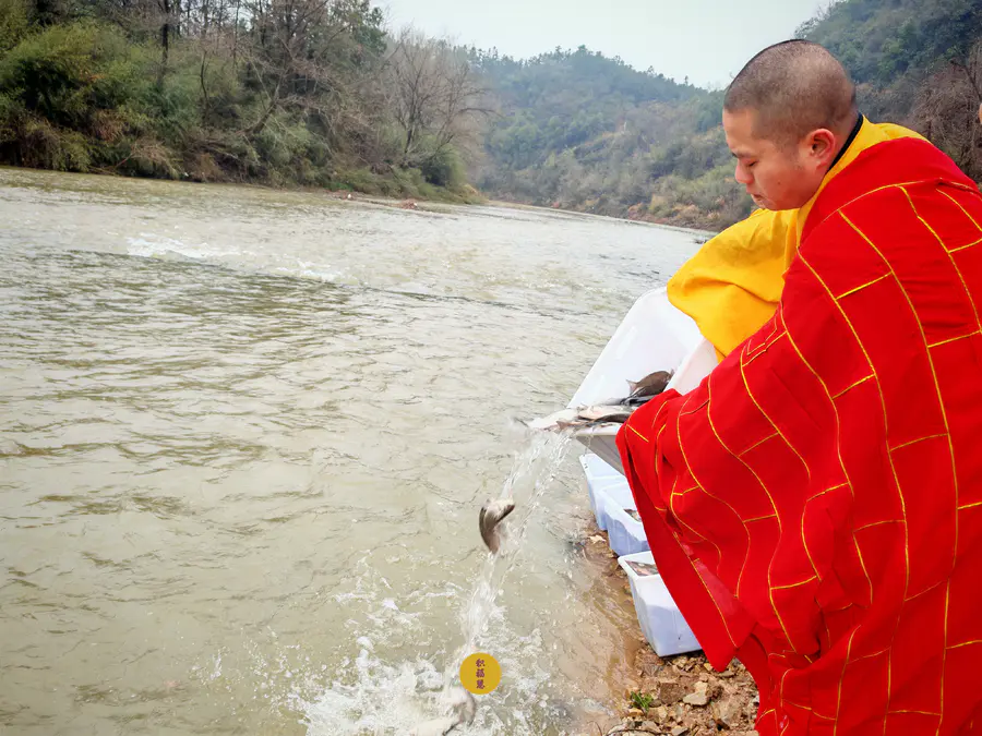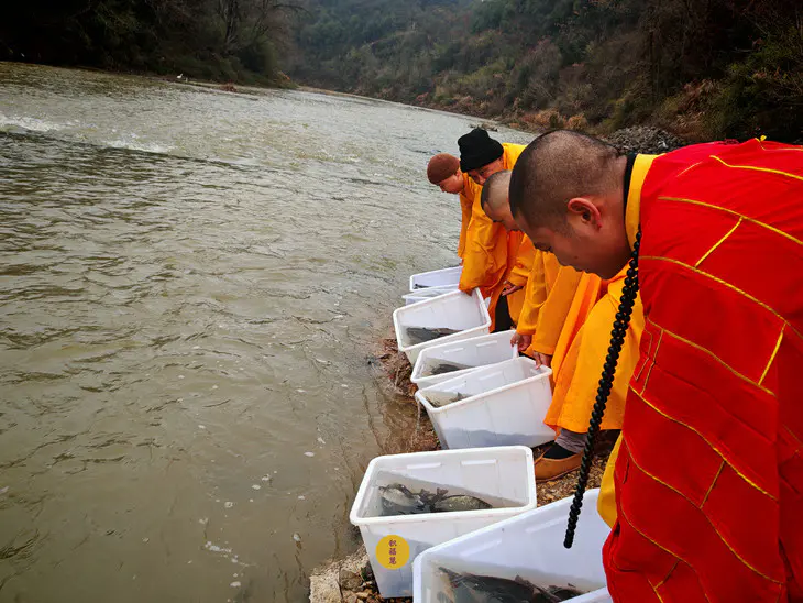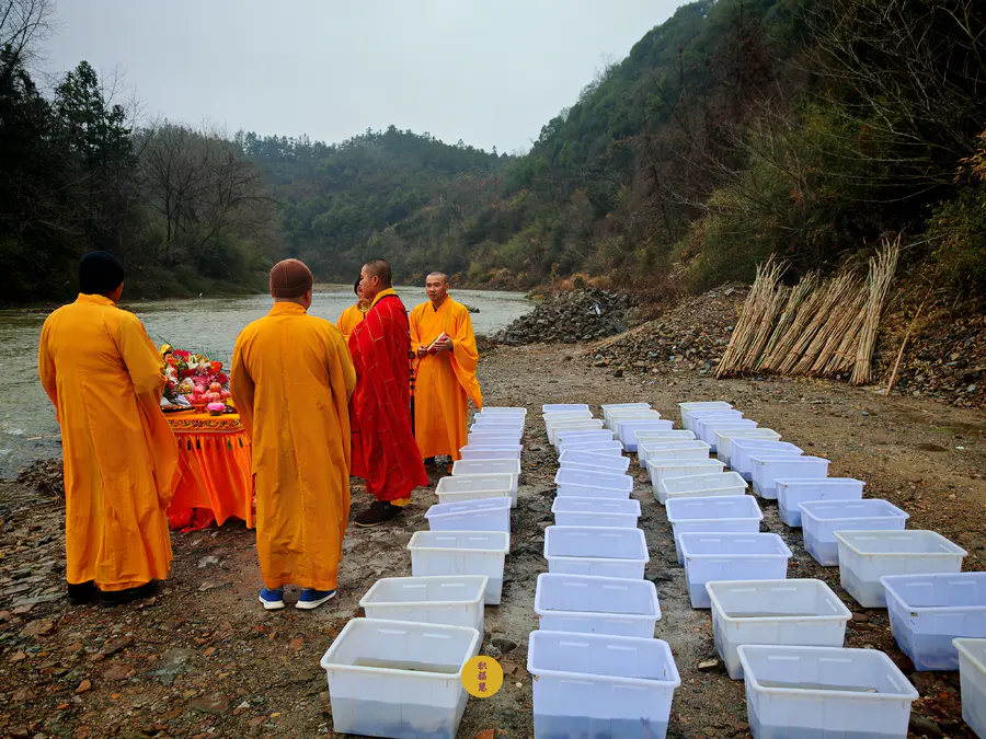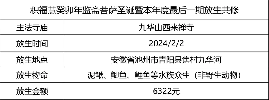 2024年2月2日,癸卯年腊月二十三,九华山西来禅寺诸位法师在安徽省池州市青阳县焦村九华河放生泥鳅、鲫鱼、鲤鱼等水族众生(非野生动物)金额合计6322元。