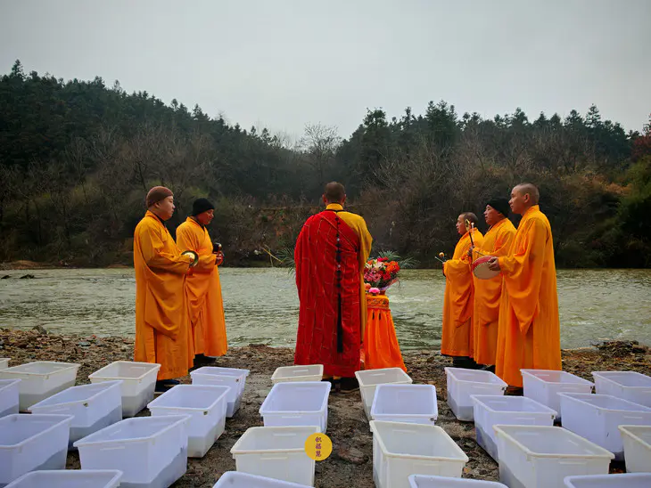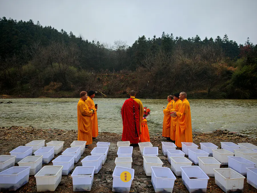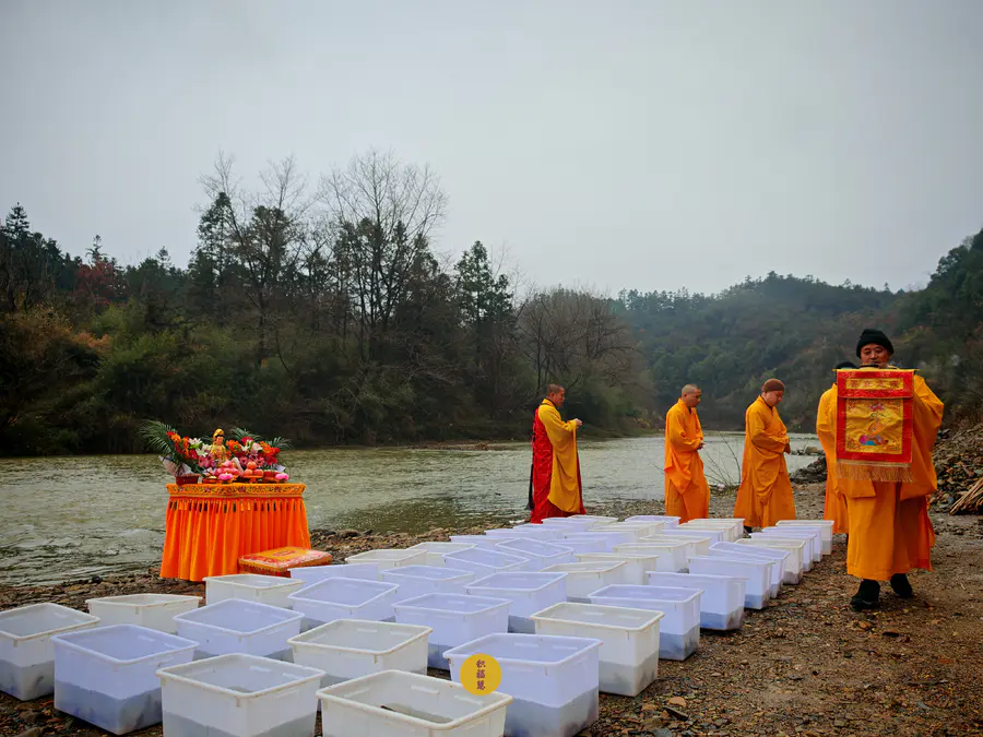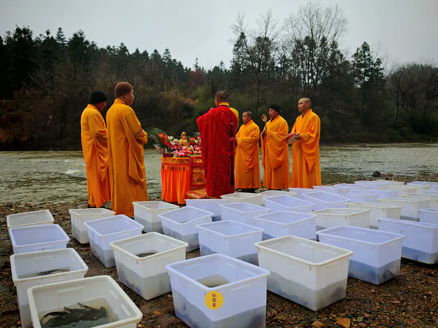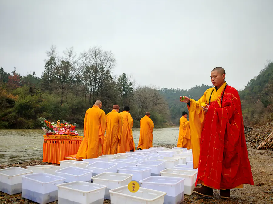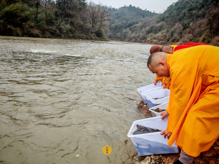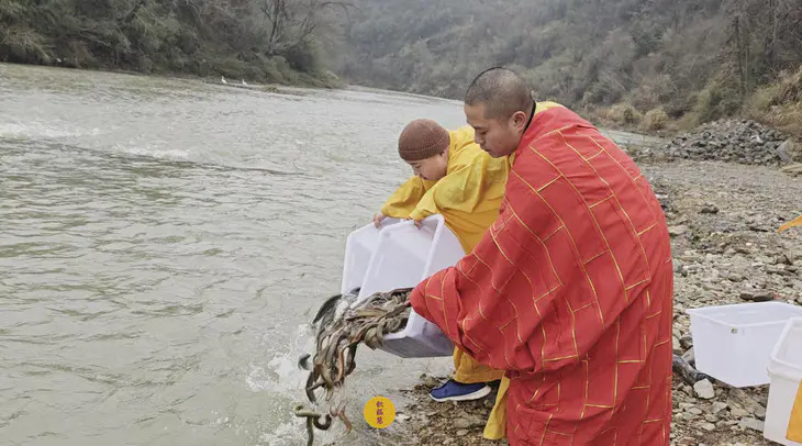 2024年2月2日,癸卯年腊月二十三,九华山西来禅寺诸位法师在安徽省池州市青阳县焦村九华河放生泥鳅、鲫鱼、鲤鱼等水族众生(非野生动物)金额合计6322元。