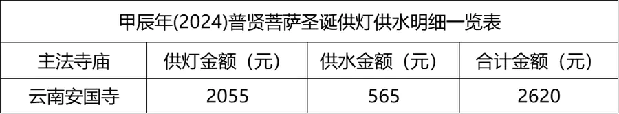 积福慧甲辰年(2024)普贤菩萨圣诞供灯供水放生共修自2024年3月19日启建,至2024年3月30日23时停止接收功德款,共计12天。同修随喜供灯款2055元,供水款565元,放生款4548元。