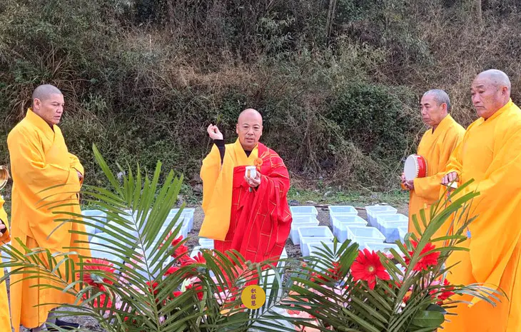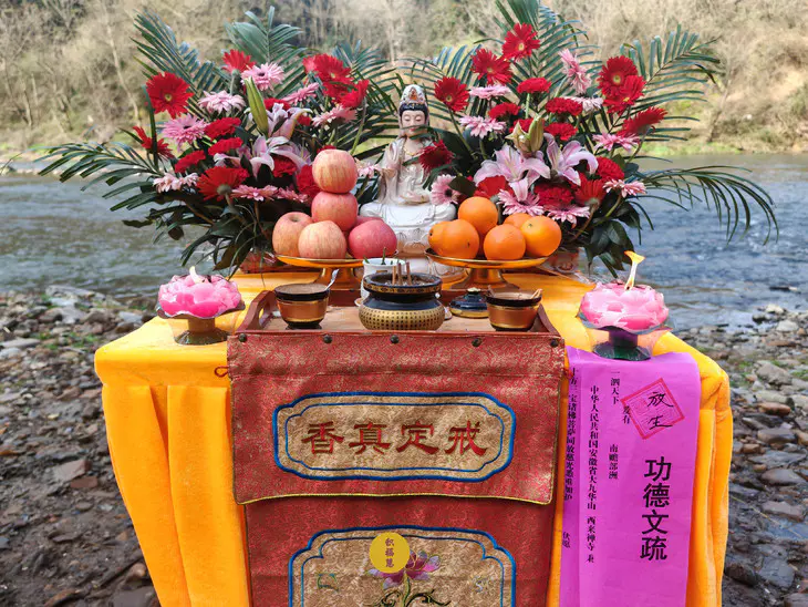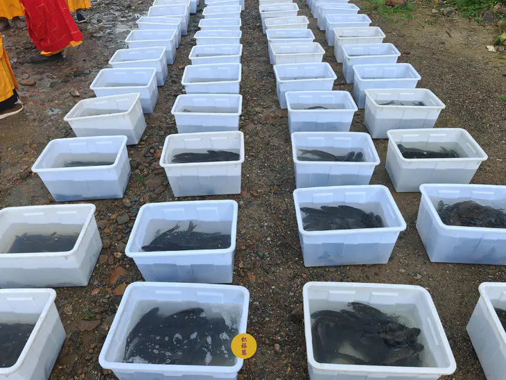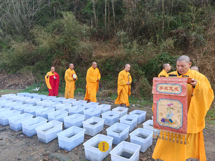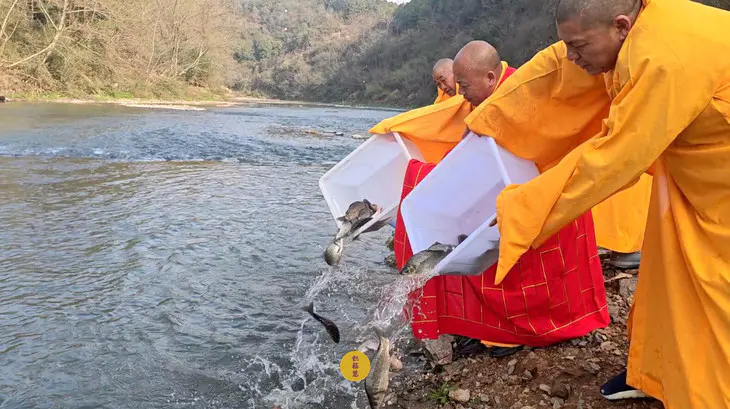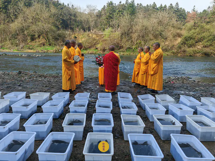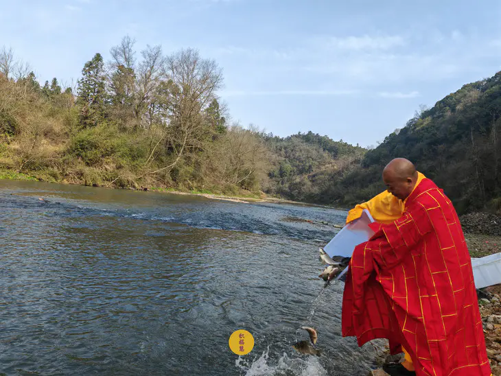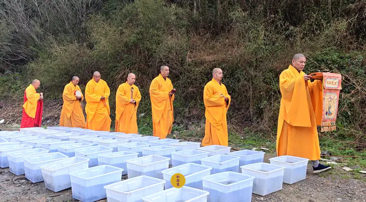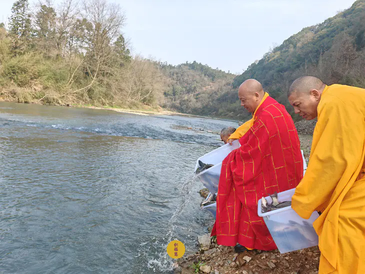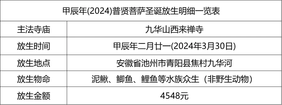 2024年3月30日,甲辰年二月廿一,云南安国寺启建普贤菩萨圣诞供灯供水法会,如理如法按次第起供,至2024年4月3日供圆满。同日,九华山西来禅寺诸位法师在安徽省池州市青阳县焦村九华河放生泥鳅、鲫鱼、鲤鱼等水族众生(非野生动物)金额合计4548元。