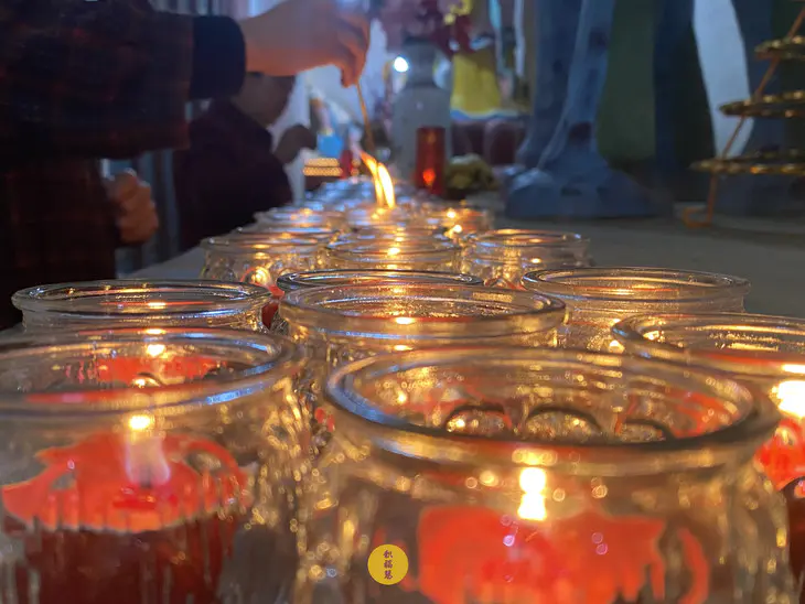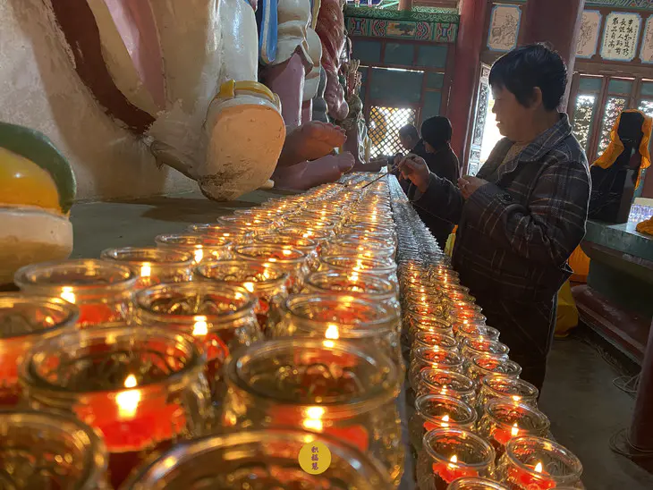 普贤菩萨圣诞日,义工菩萨们早早来到云南安国寺,有条不紊地洒扫、摆灯,之后在大雄宝殿燃起十方善信发心供养的酥油灯。