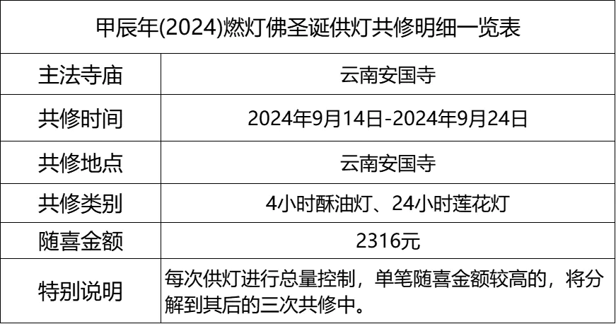 2024年9月24日,甲辰年八月廿二,云南安国寺启建燃灯佛圣诞供灯法会,如理如法按次第起供,至2024年9月30日供圆满。