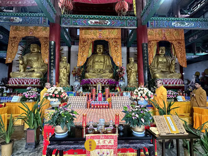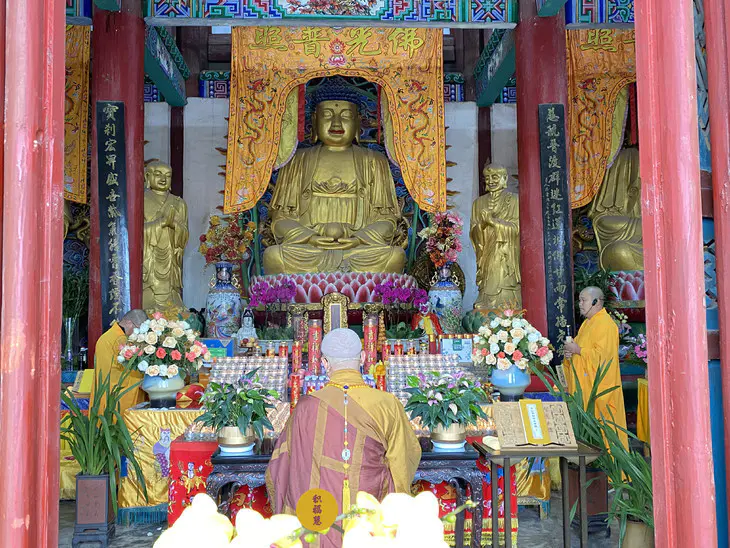祝圣法会开始。与会大众,摄心正念,合掌礼拜,虔诚恭敬,法喜充满,僧俗两序共同讽诵经文,虔诚跪拜,敬礼诸佛。