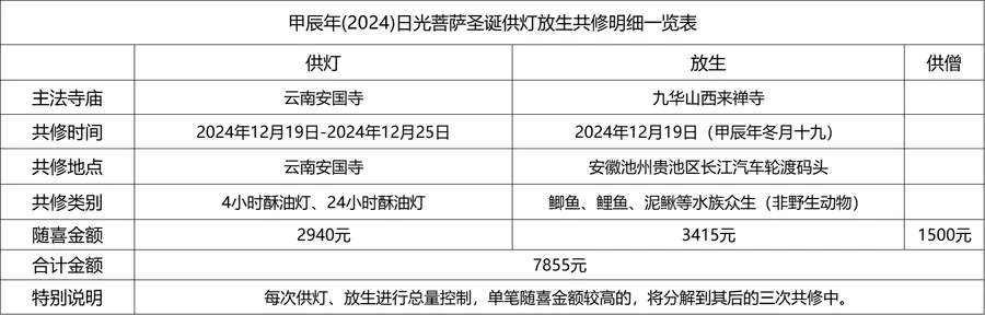 积福慧甲辰年日光菩萨圣诞供灯放生共修自2024年12月3日启建,至2024年12月19日23时停止接收功德款,共计17天。