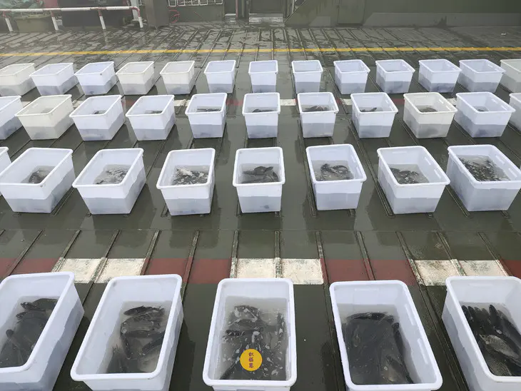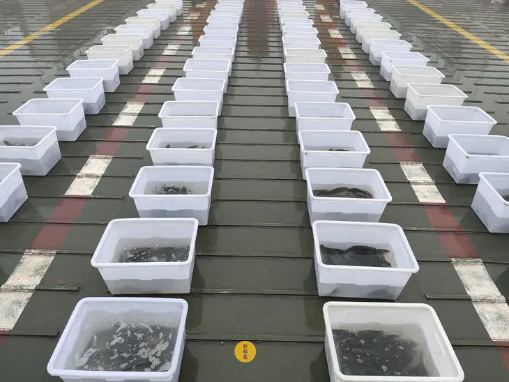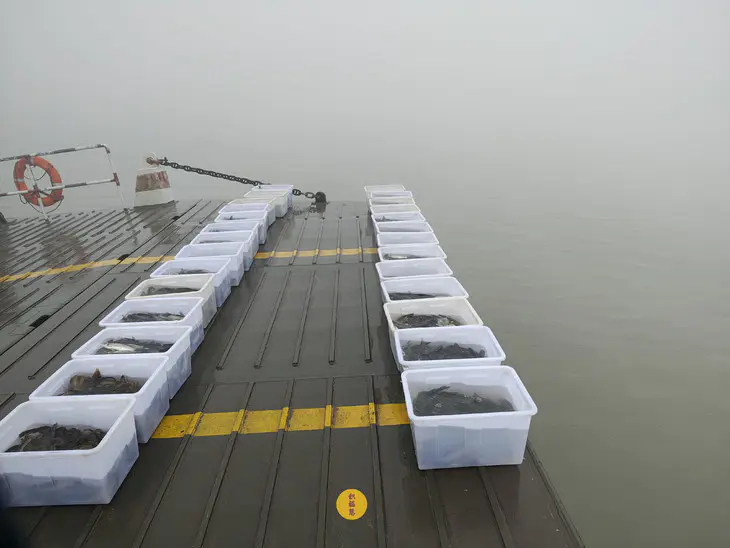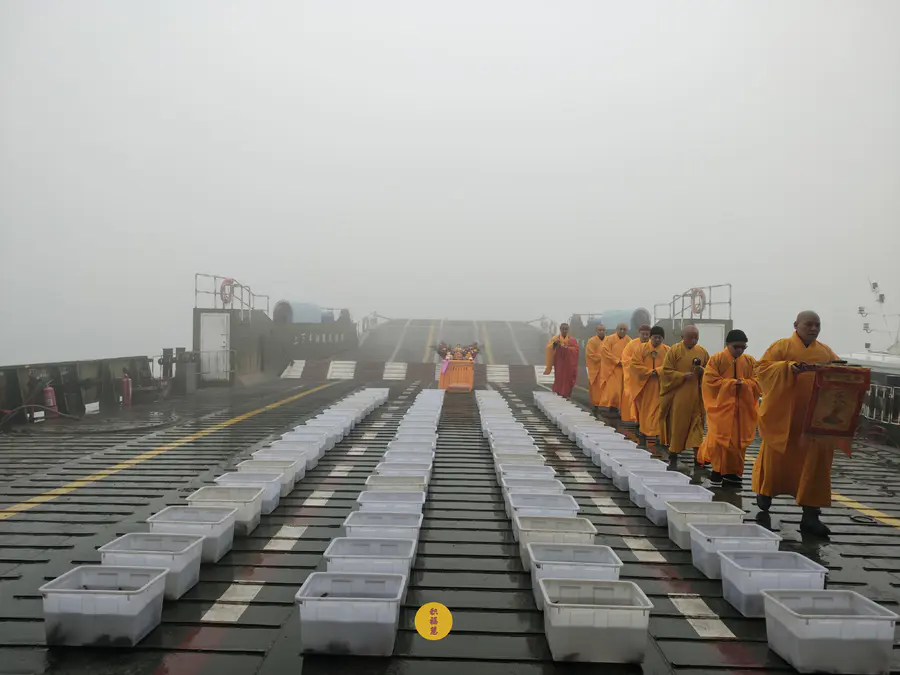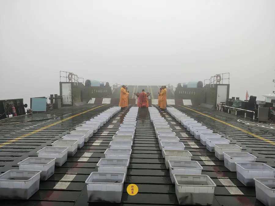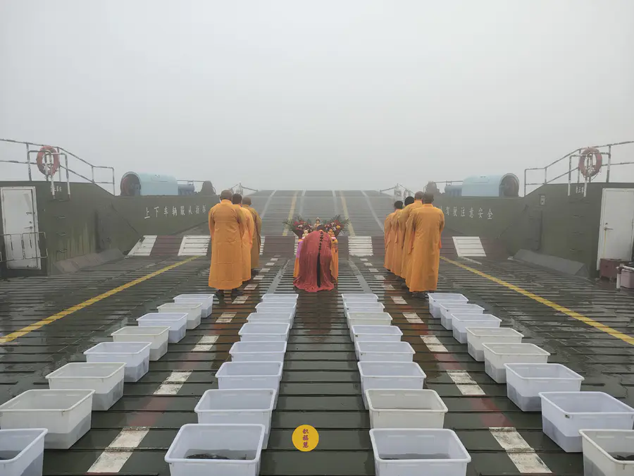 放生仪轨圆满,将放生物移至栈桥边,开始放生。