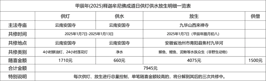 积福慧甲辰年(2025)释迦牟尼佛成道日供灯供水放生共修自2025年1月3日启建,至2025年1月7日23时停止接收功德款,共计5天。