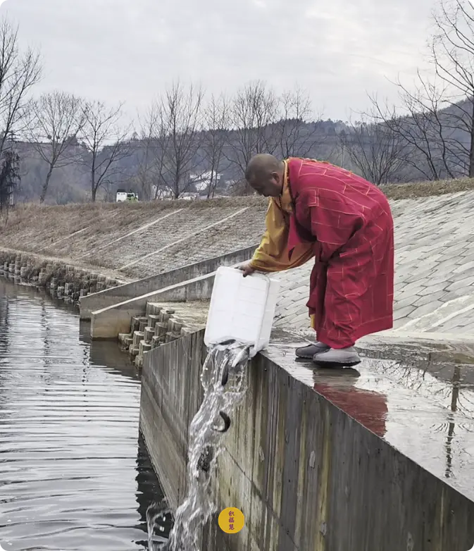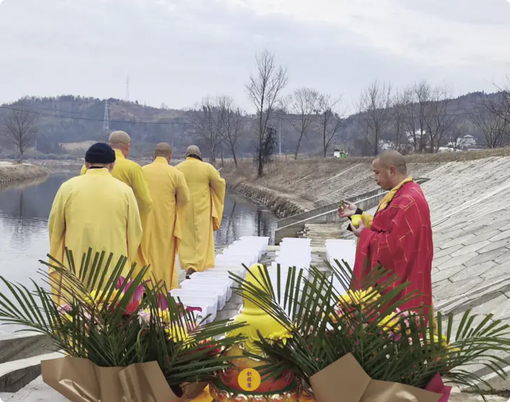 九华河边,主法法师手捧甘露水,以杨枝遍洒被放物命,仰乞十方三宝威德冥加,令其早得解脱。