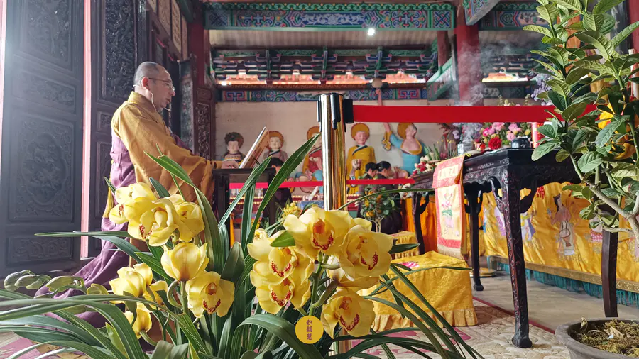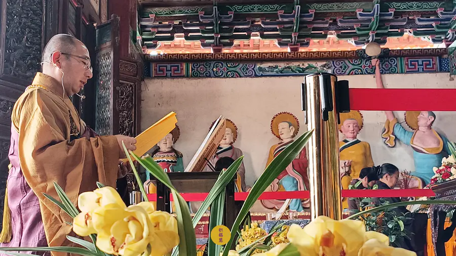 释迦牟尼佛出家日祝祷法会开始,主法法师拈香,宣读功德文疏,四众弟子,合掌礼赞,虔诚唱诵香赞。
