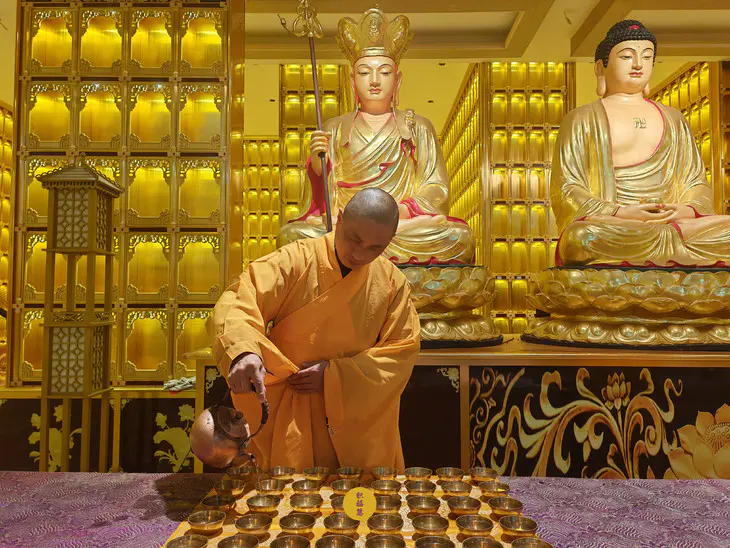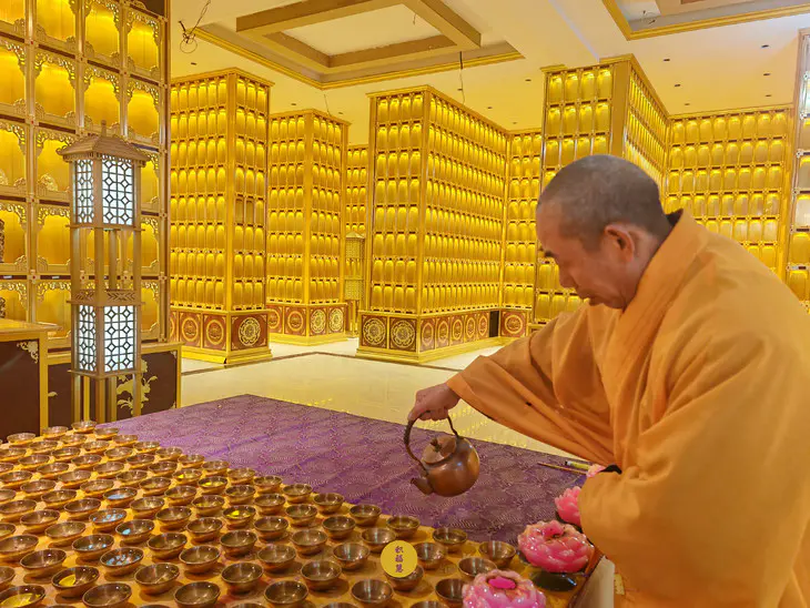 九华山西来禅寺供灯供水祈福法会开始。众法师齐唱香赞,法器震响,菩提心发,诵经赞佛,声声宏亮,法喜充满。
