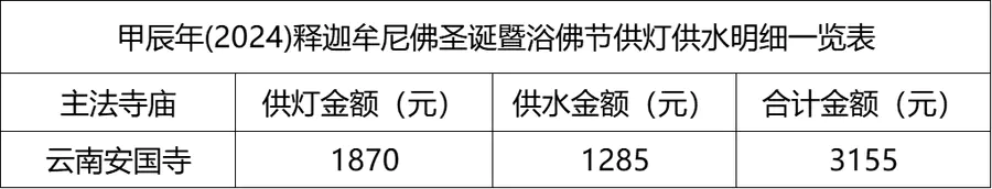 积福慧甲辰年释迦牟尼佛圣诞暨浴佛节供灯供水放生共修自2024年4月26日启建,至2024年5月15日23时停止接收功德款,共计20天。同修随喜供灯款1870元,供水款1285元,放生款4335元。