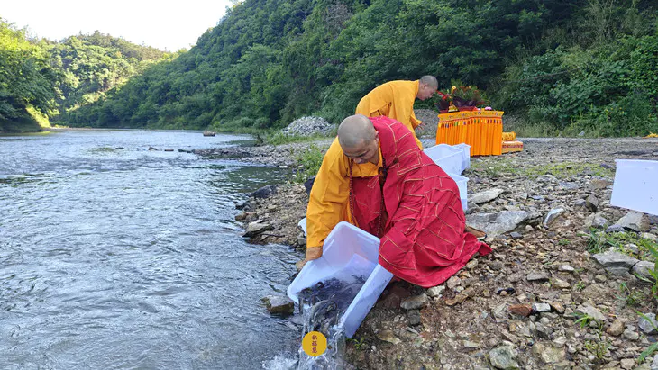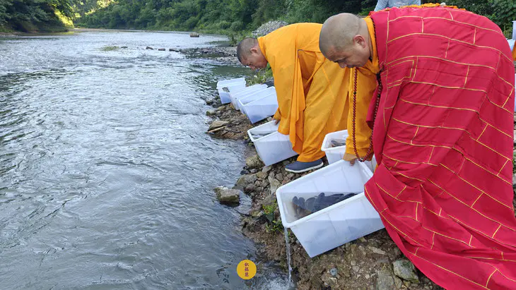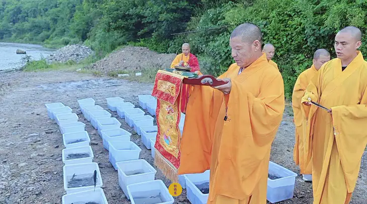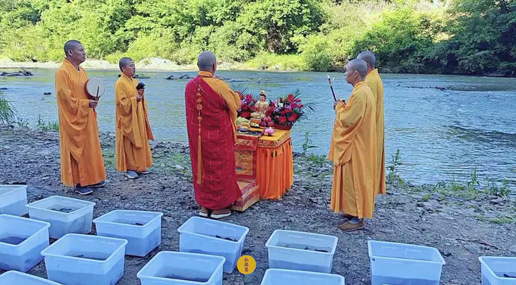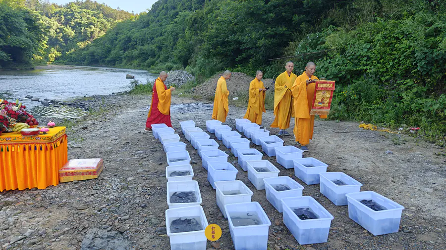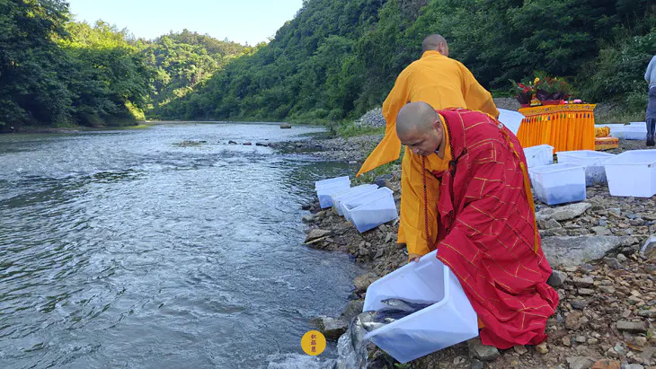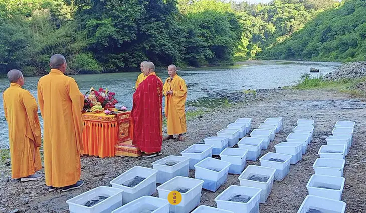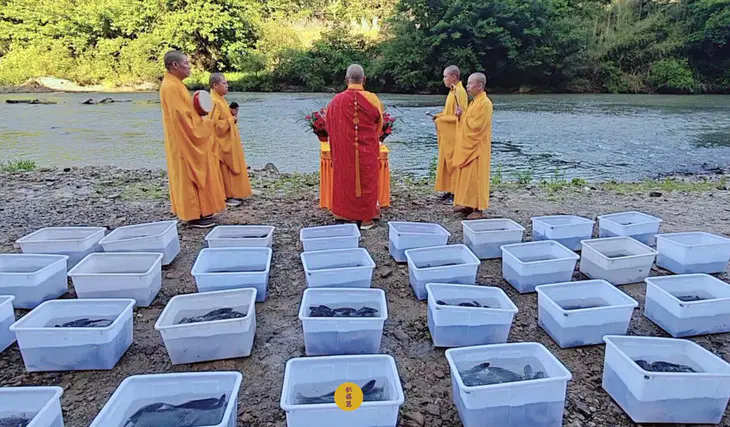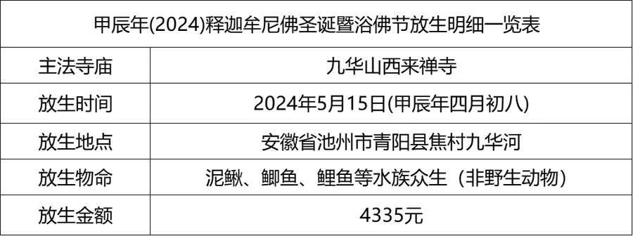 2024年5月15日,甲辰年四月初八,云南安国寺启建释迦牟尼佛圣诞暨浴佛节供灯供水法会,如理如法按次第起供,至2024年5月21日供圆满。九华山西来禅寺诸位法师在安徽省池州市青阳县焦村九华河放生泥鳅、鲫鱼、鲤鱼等水族众生(非野生动物)金额合计4335元。