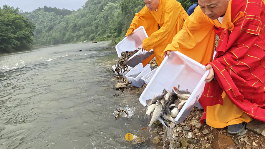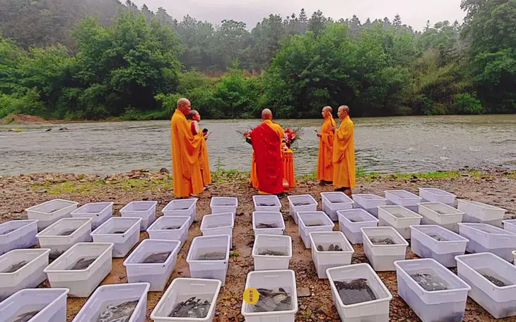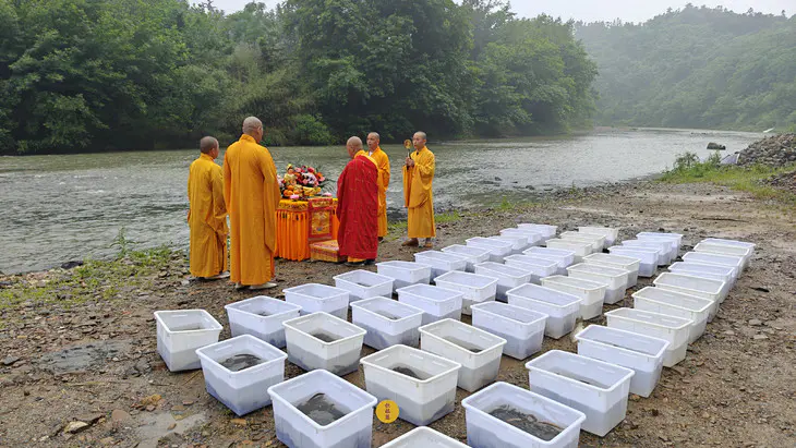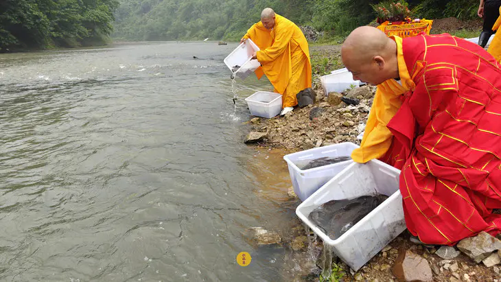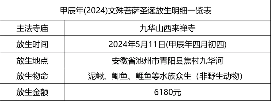 2024年5月11日,甲辰年四月初四,云南安国寺启建文殊菩萨圣诞供灯供水法会,如理如法按次第起供,至2024年5月17日供圆满。同日,九华山西来禅寺诸位法师在安徽省池州市青阳县焦村九华河放生泥鳅、鲫鱼、鲤鱼等水族众生(非野生动物)金额合计6180元。