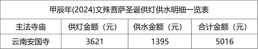 积福慧甲辰年(2024)文殊菩萨圣诞供灯供水放生共修自2024年4月11日启建,至2024年5月11日23时停止接收功德款,共计31天。同修随喜供灯款3621元,供水款1395元,放生款6180元。