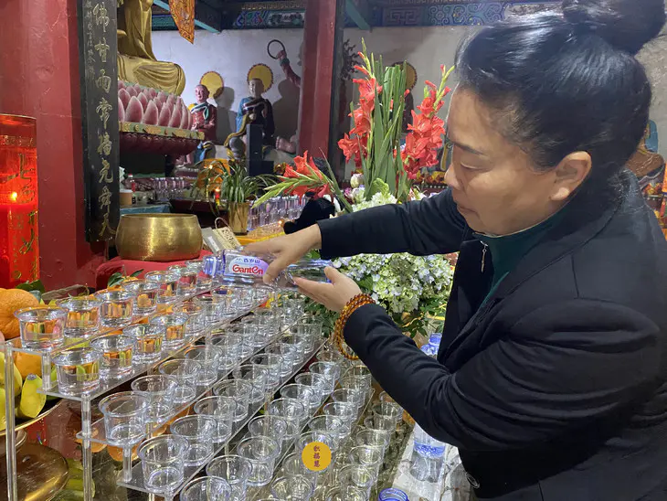 用镊子夹起酥油灯灯芯,方便大众点灯