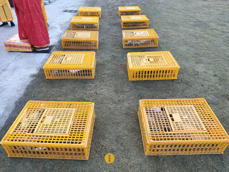 与会法师逐一释放笼内的鸽子,使之得享自由