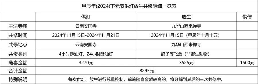 积福慧甲辰年下元节供灯放生共修自2024年11月2日启建,至2024年11月15日23时停止接收功德款,共计14天。