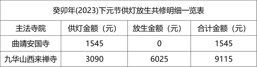 积福慧癸卯年下元节共修自2023年11月6日启建,至2023年11月27日23时停止接收功德款,共计22天。同修随喜供灯款4635元,放生款6205元。