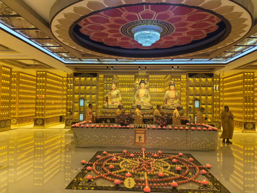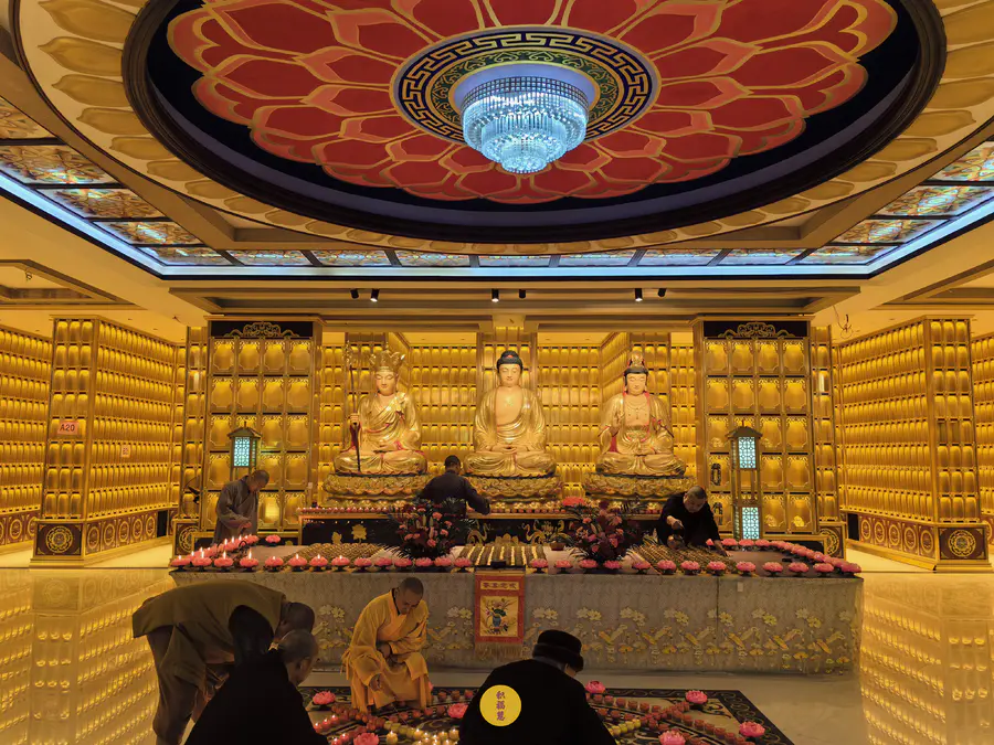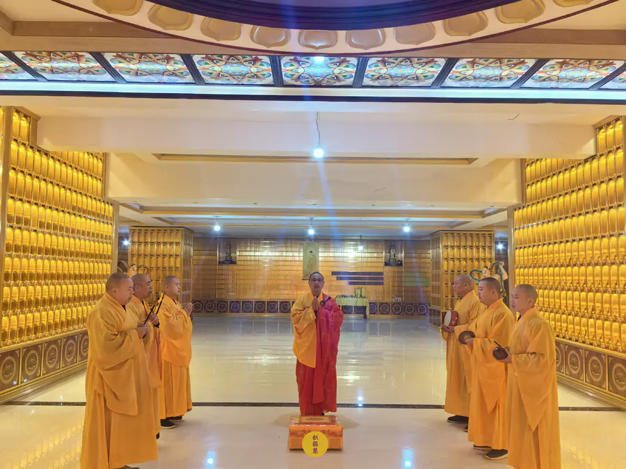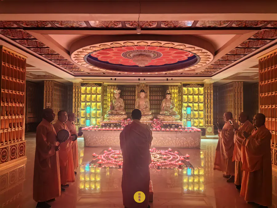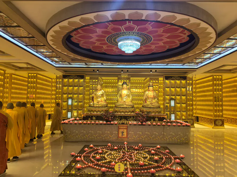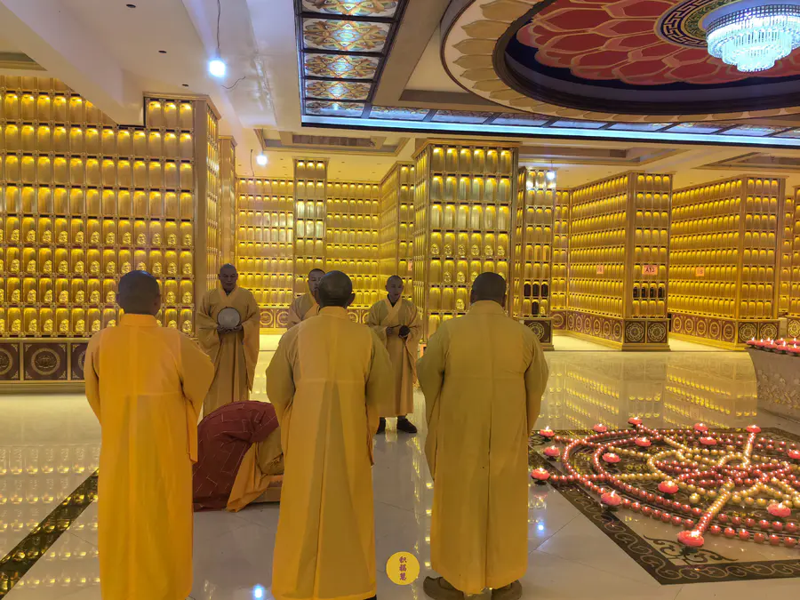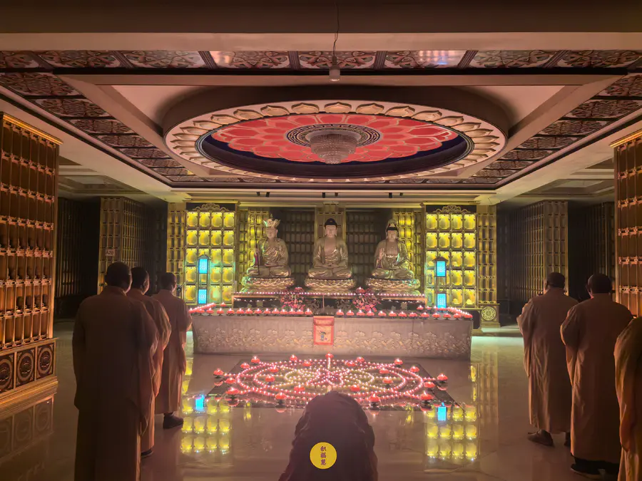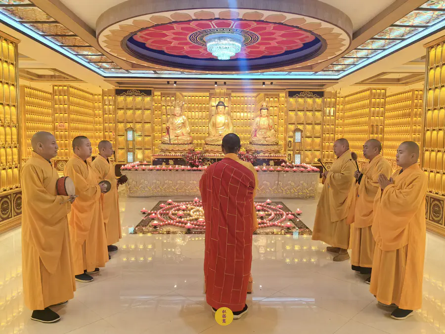 伴随法师们的梵呗唱诵,法音流转,灯灯互摄。下元节供灯祈福法会正式开始。法师虔诚礼佛,诵经祈福,现场庄严、清净而隆重。